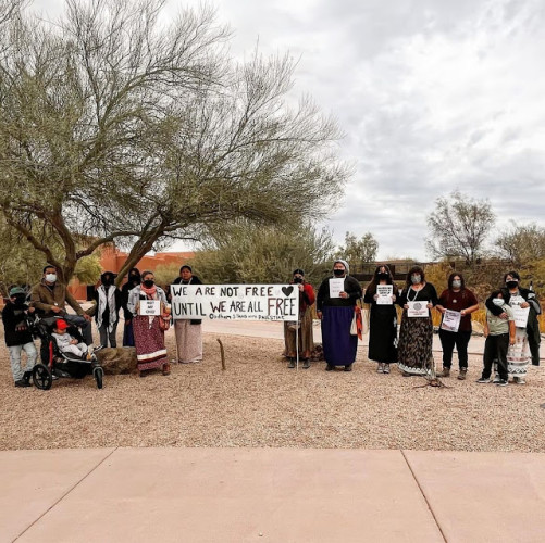 GILA RIVER INDIAN COMMUNITY, Arizona -- Outside of the Gila River Indian Community tribal Inauguration, consisting of Tohono O’odham and Akimel O’odham tribal governments, along with the state governor, politicians -- and we still held it down in prayer. Informing people that our lands are being exploited and heavily militarized by Israeli-trained police, Israeli-trained border patrol, Israeli-partnered facilities and Israeli surveillance towers that keep community members from coming back home. Had to remind the mi:ligan cops and employees where they’re at after poor attempts to dispute with us.