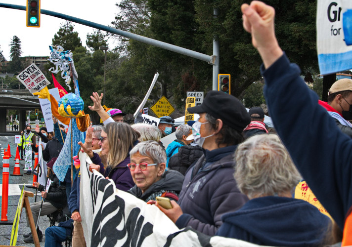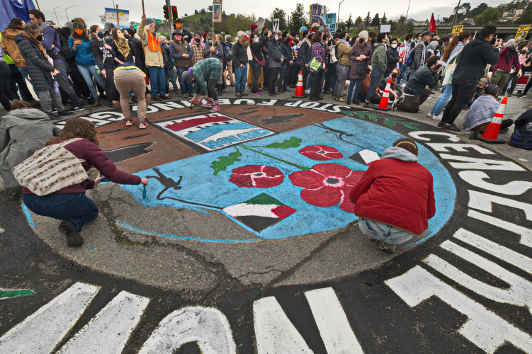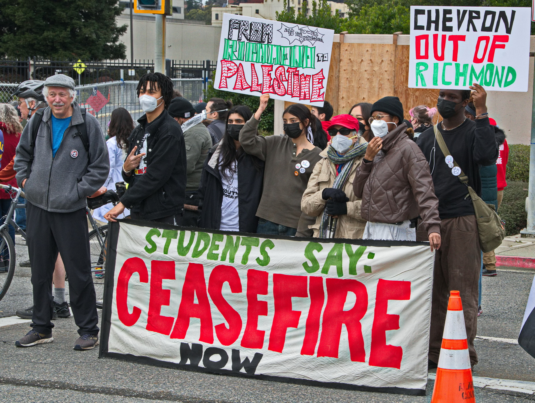 (CHEVRON REFINERY, RICHMOND, Feb. 3) - From young to old, about 500 activists held a loud rally to protest Chevron's involvement in Israel's genocidal attack on Gaza. They took over the area on front of Gate 14 and painted a mural by David Solnit on the pavement. Speakers included Richmond's mayor, medical workers from UC, and activists from peace and environmental groups. Musicians and poets performed.For the past three months, the Israeli Occupation Forces have indiscriminately bombed and killed over 30,000 Palestinians living in Gaza, half of them children. This is a genocide and an attempted land-grab.
