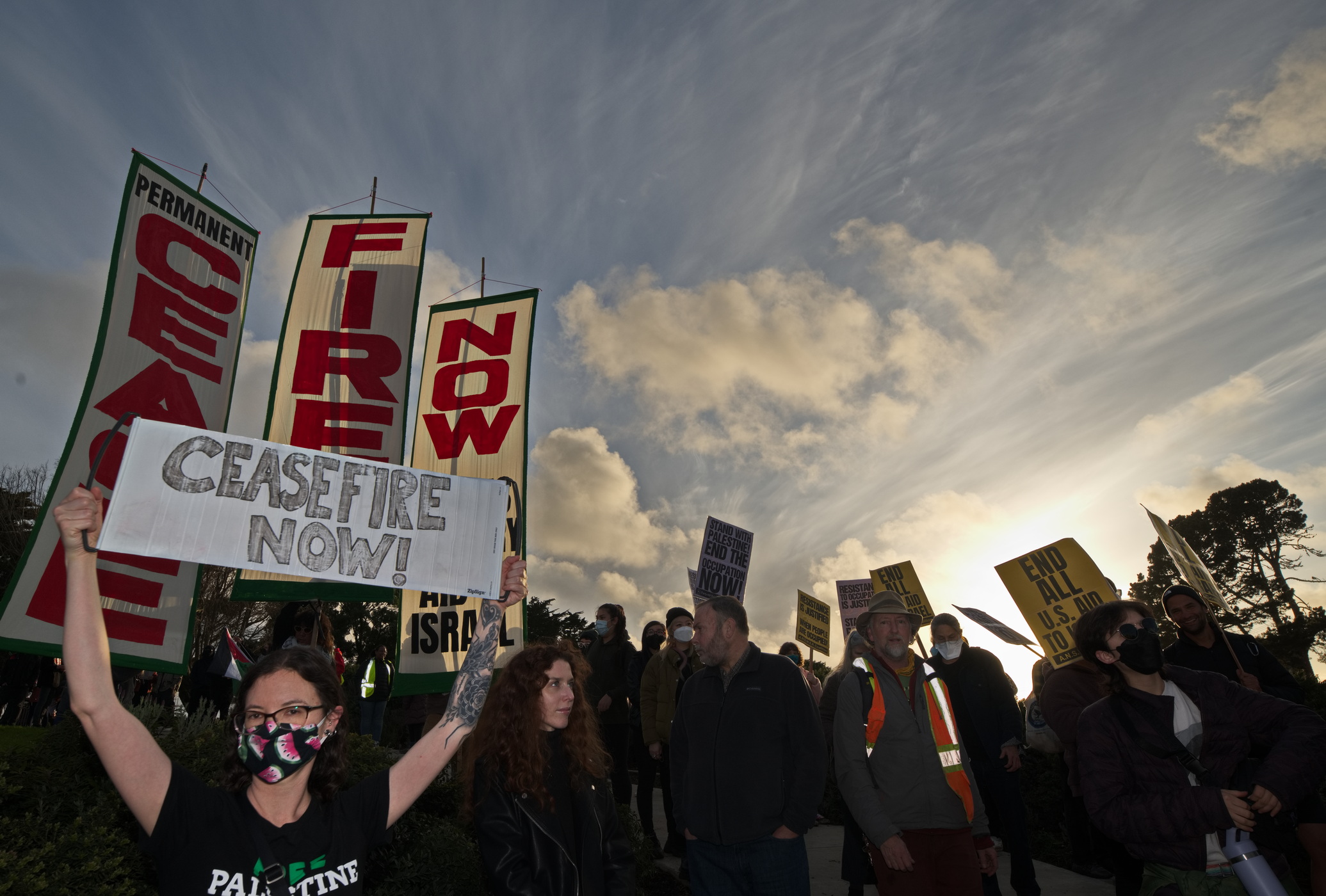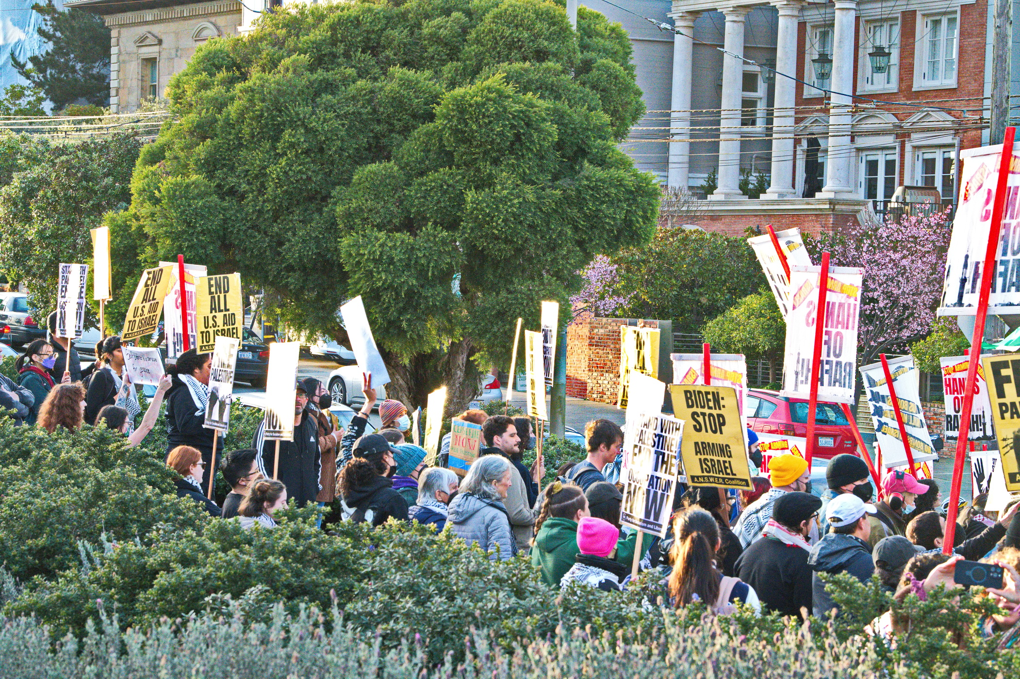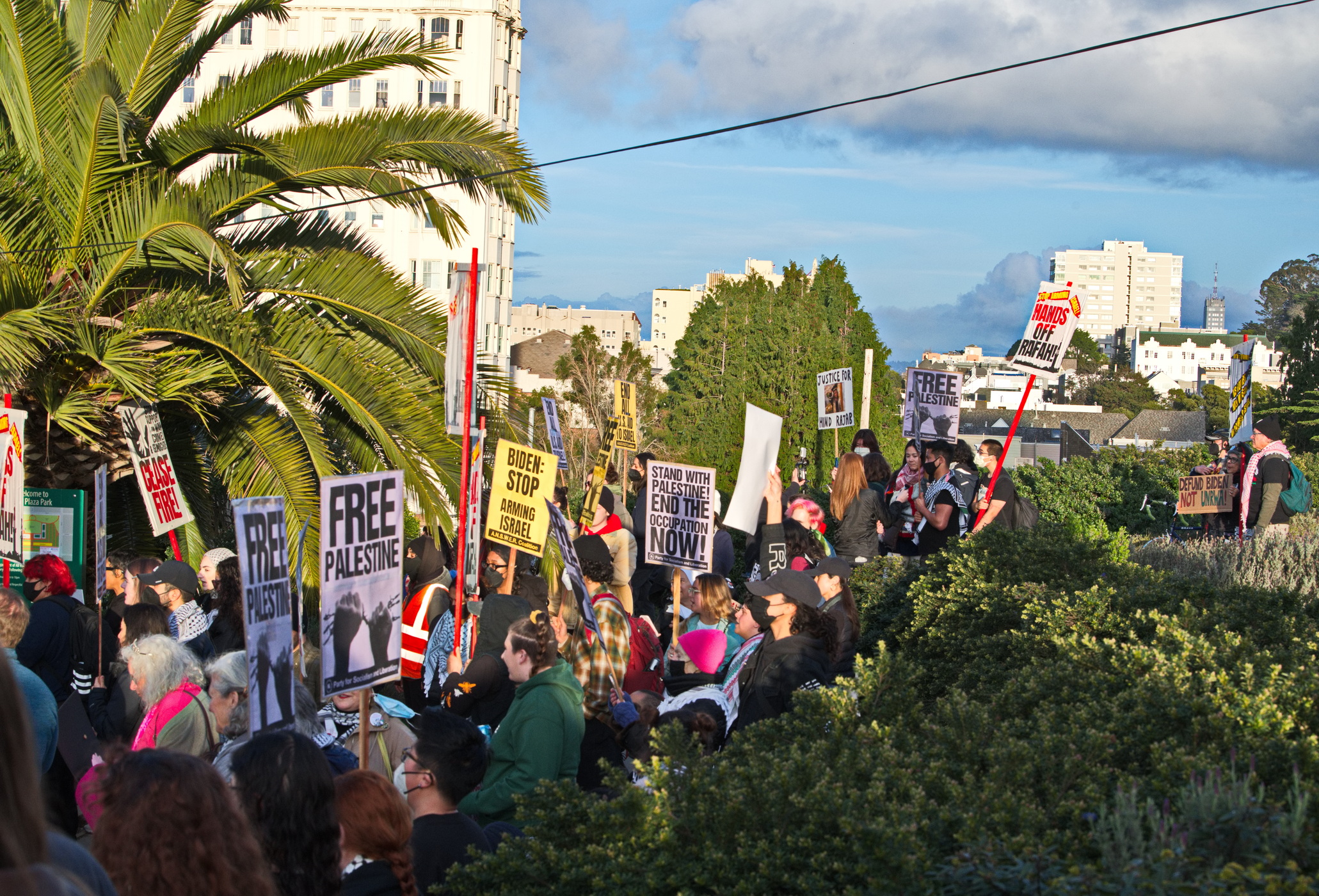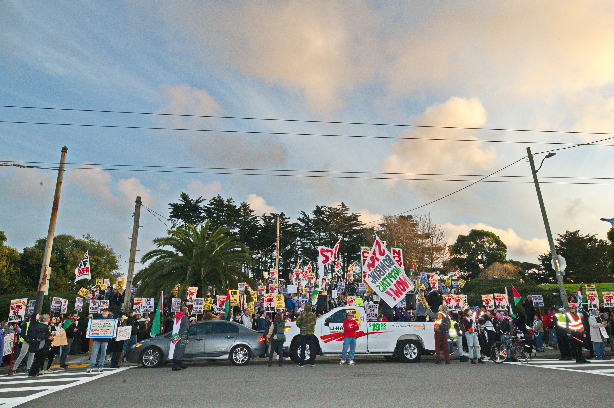 (SAN FRANCISCO, Feb. 21) The protesters assembled in Alta Plaza Park beginning at 5pm. A truck with sound equipment soon arrived followed by David Solnit with hundreds of signs including his gigantic cease fire signs seen in many Bay Area actions. Speakers blasted the war crimes US tax dollars are enabling. Eventual Palestinian freedom was proclaimed and yes, from the river to the sea.Protesters from teenagers to seniors then marched through the area. Most all wore some form of keffiya, today's de rigeur protest fashion accessory. Many women in traditional Arab dress marched.