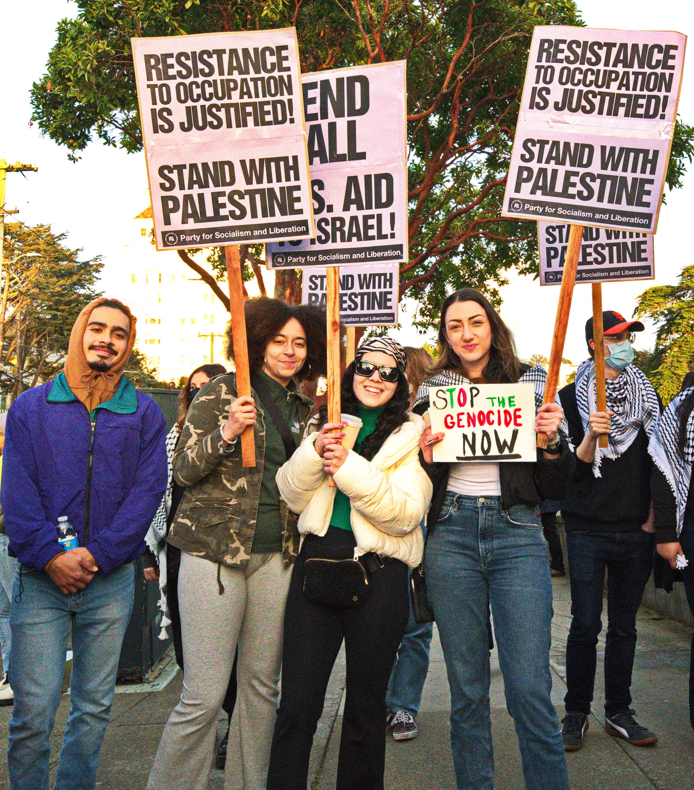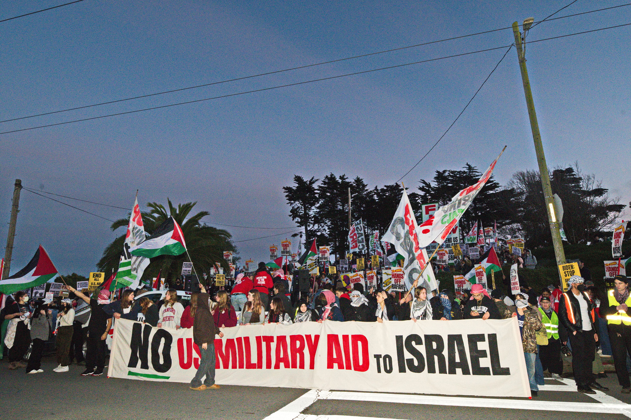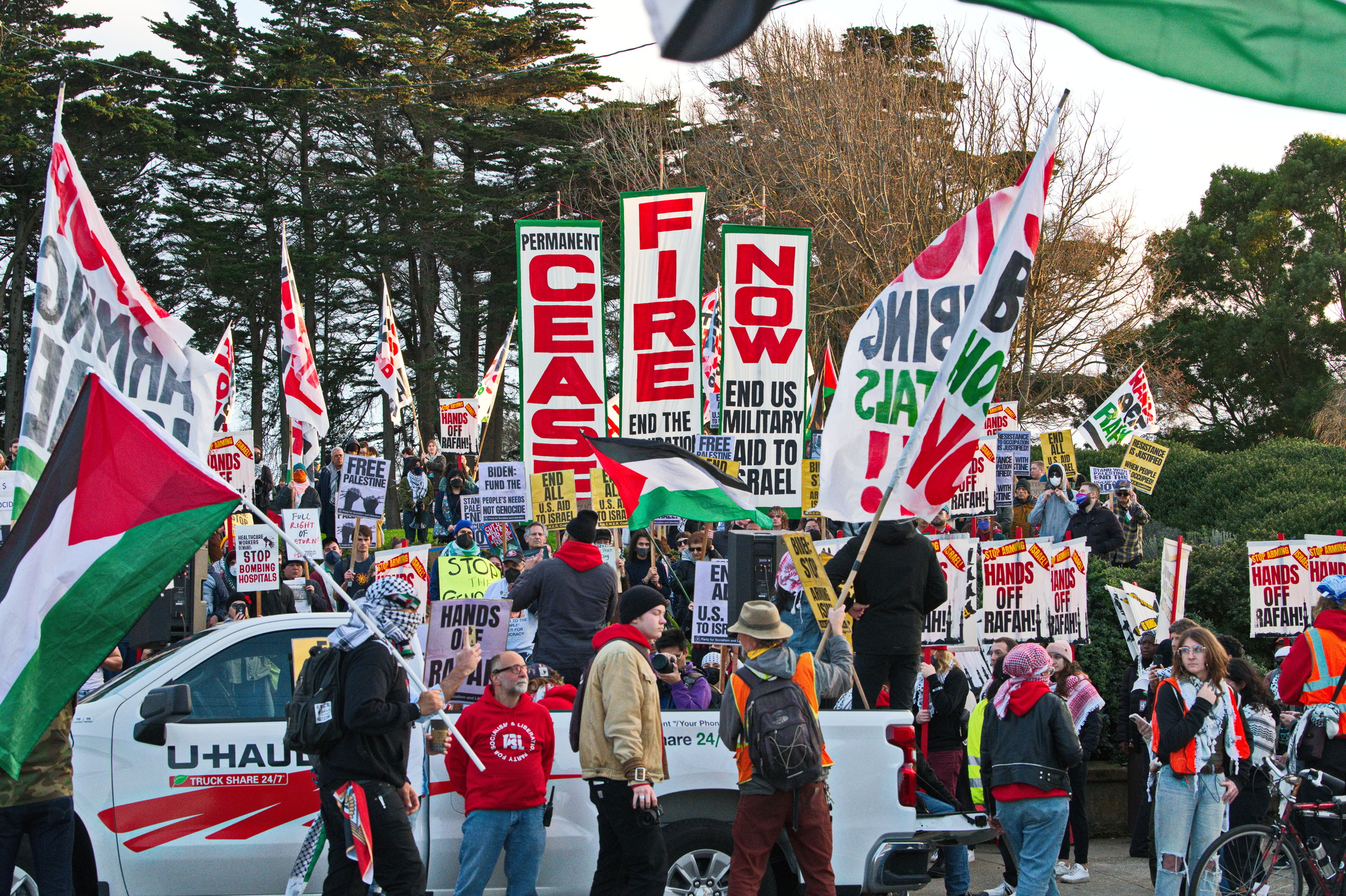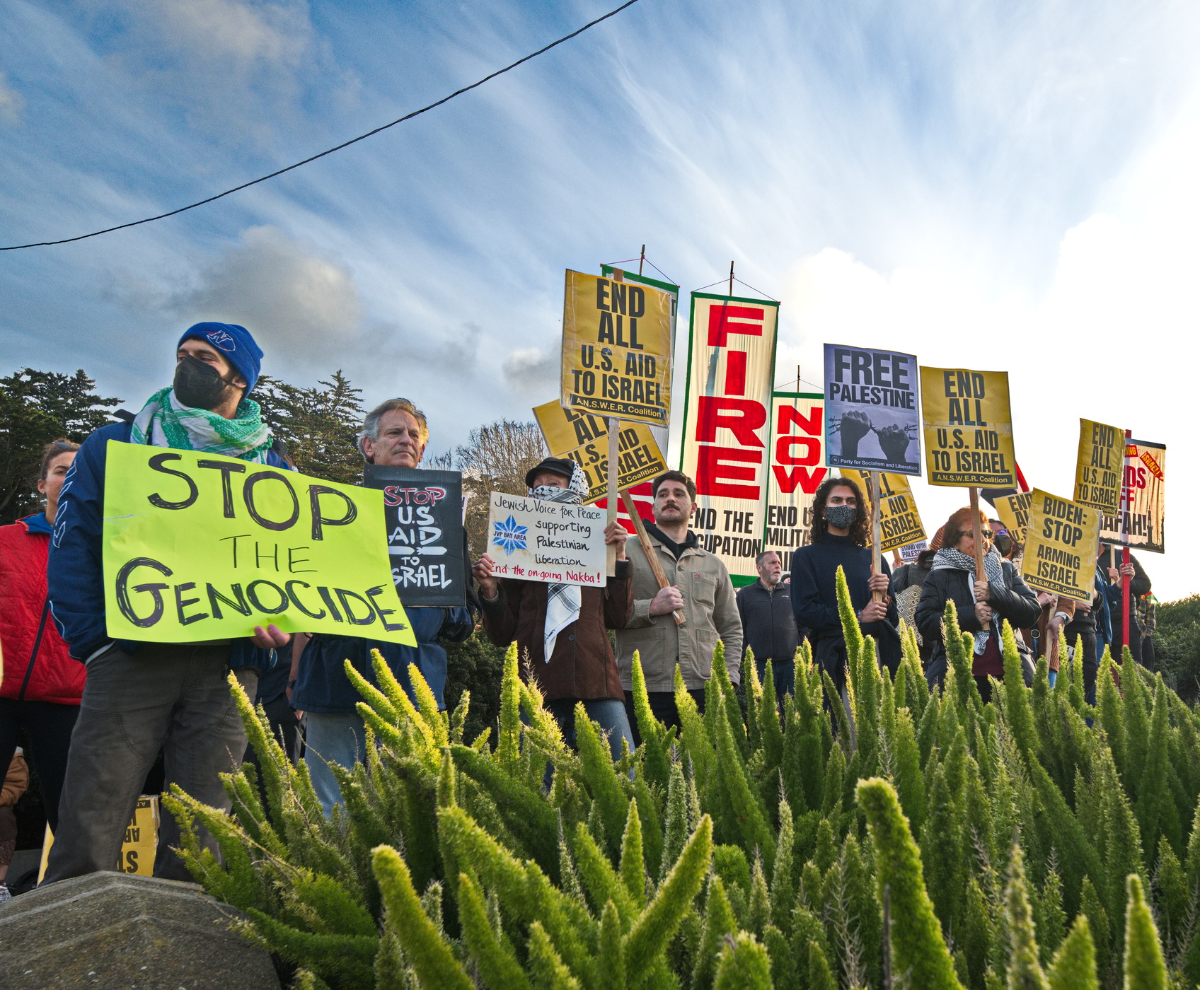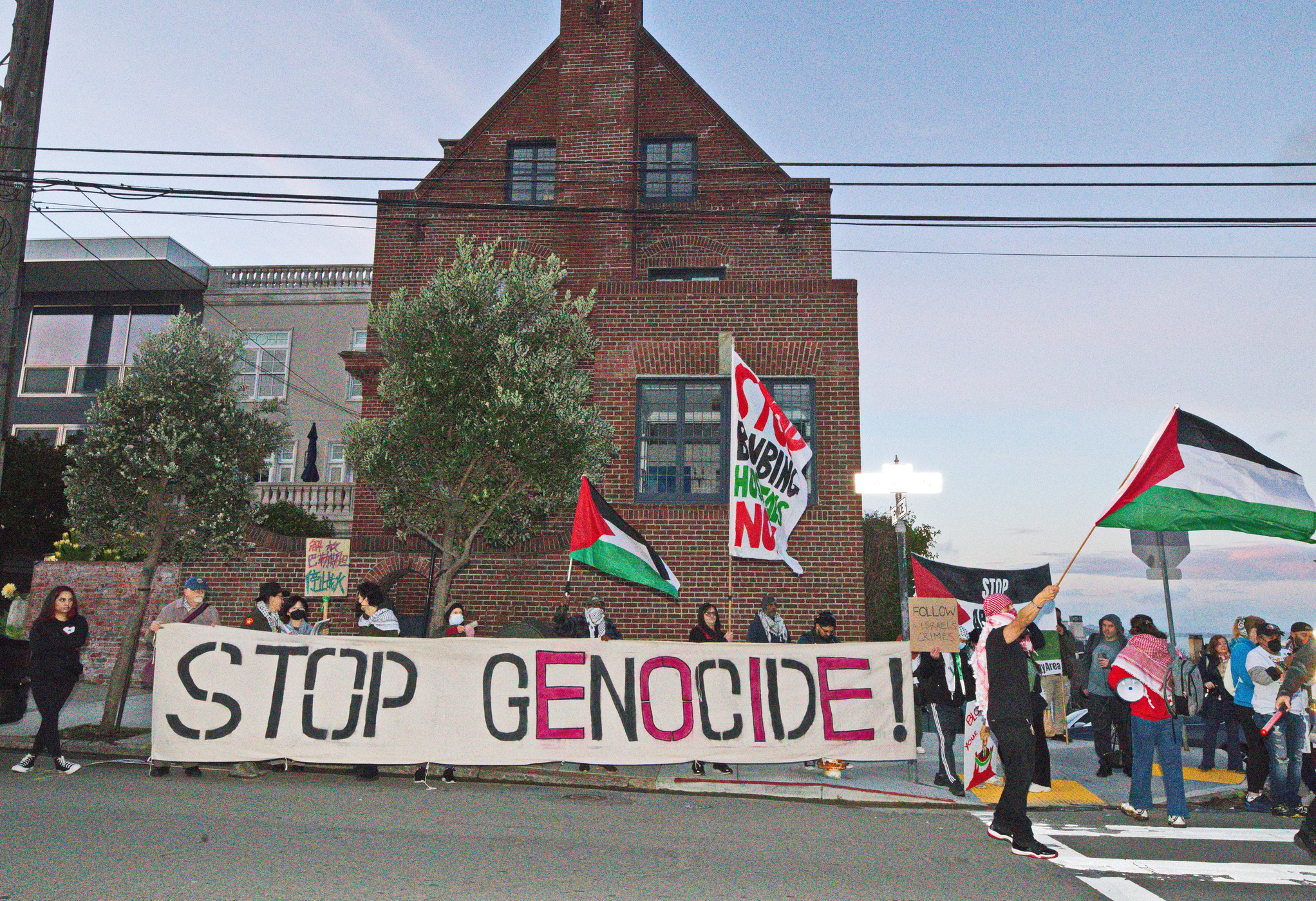 (SAN FRANCISCO, Feb. 21) The protesters assembled in Alta Plaza Park beginning at 5pm. A truck with sound equipment soon arrived followed by David Solnit with hundreds of signs including his gigantic cease fire signs seen in many Bay Area actions. Speakers blasted the war crimes US tax dollars are enabling. Eventual Palestinian freedom was proclaimed and yes, from the river to the sea.Protesters from teenagers to seniors then marched through the area. Most all wore some form of keffiya, today's de rigeur protest fashion accessory. Many women in traditional Arab dress marched.