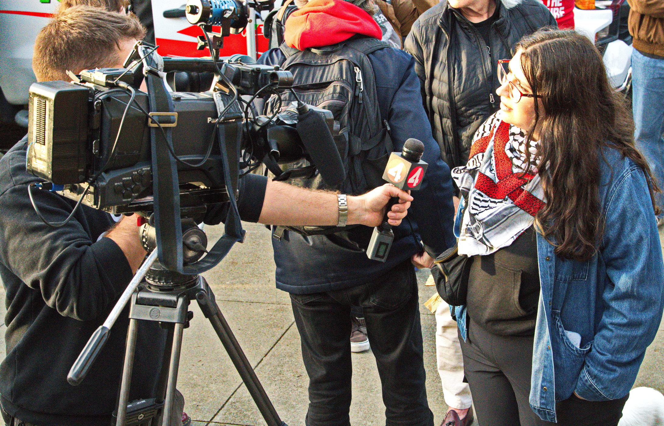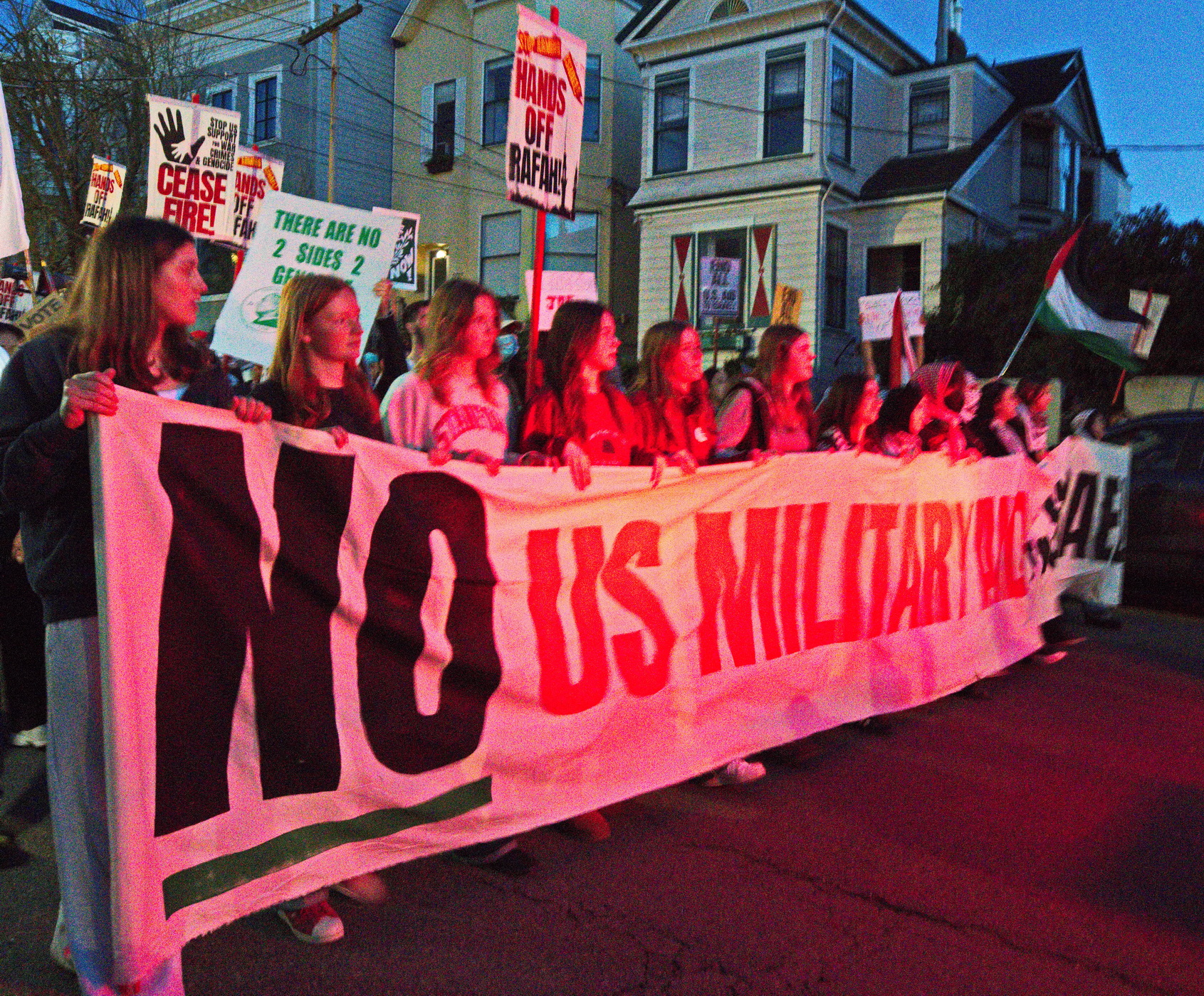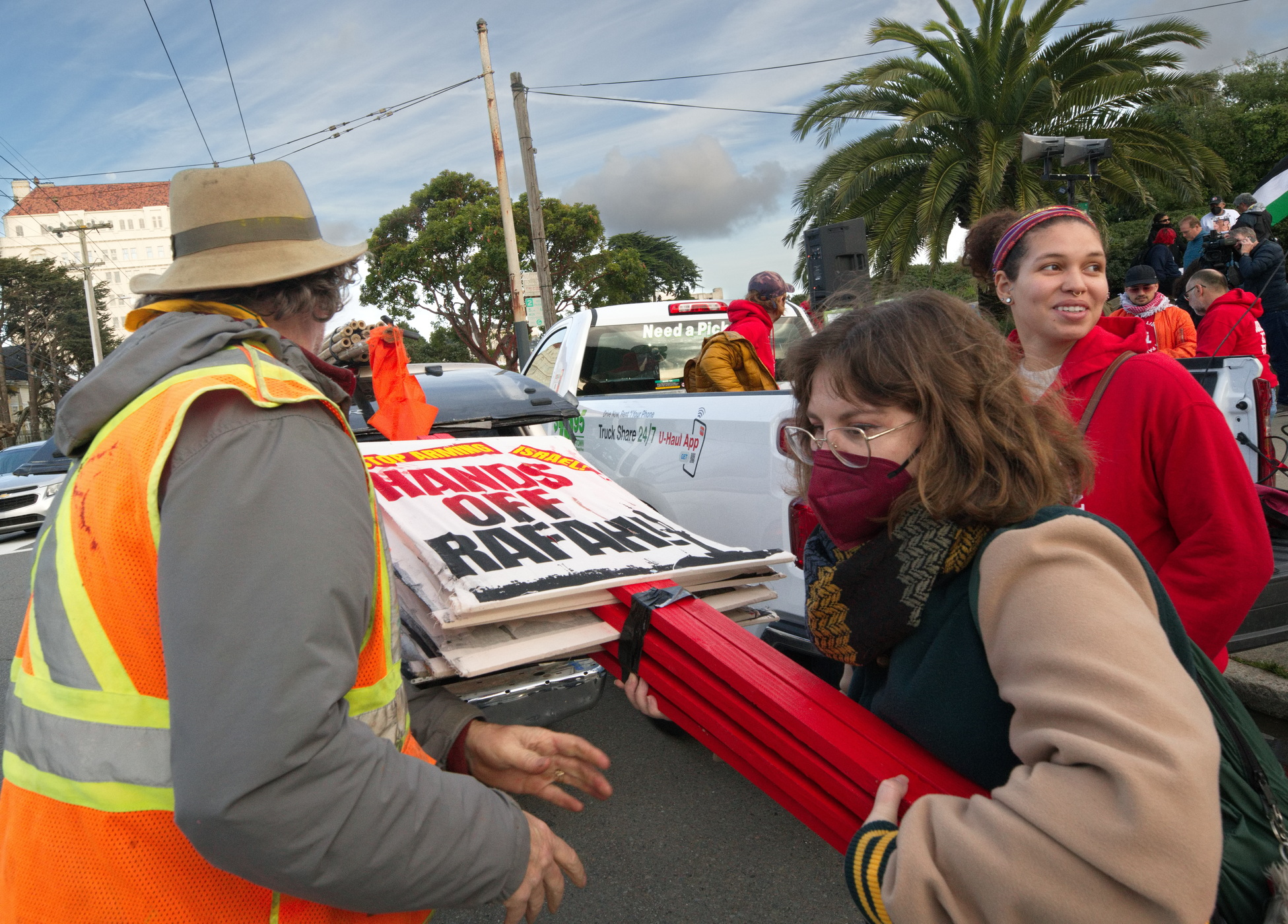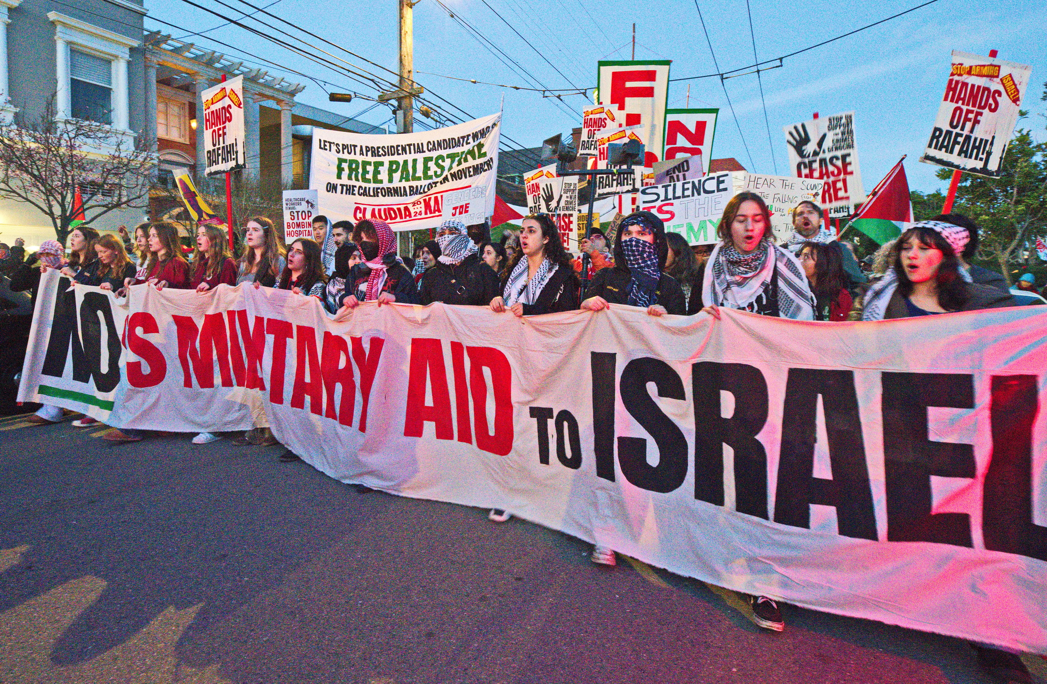 (SAN FRANCISCO, Feb. 21) The protesters assembled in Alta Plaza Park beginning at 5pm. A truck with sound equipment soon arrived followed by David Solnit with hundreds of signs including his gigantic cease fire signs seen in many Bay Area actions. Speakers blasted the war crimes US tax dollars are enabling. Eventual Palestinian freedom was proclaimed and yes, from the river to the sea.Protesters from teenagers to seniors then marched through the area. Most all wore some form of keffiya, today's de rigeur protest fashion accessory. Many women in traditional Arab dress marched.