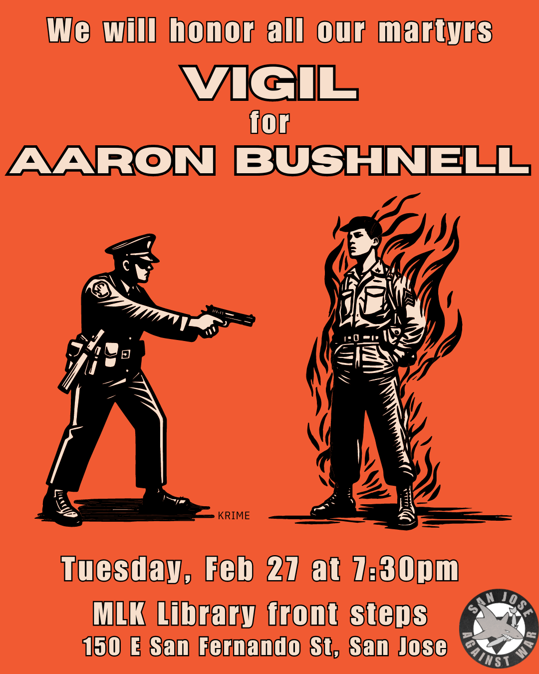 Join us tomorrow in San Jose for a vigil for Aaron Bushnell, the courageous man who self-immolated in front of the Israeli embassy in protest of the genocide against Gaza. Tuesday, Feb 27 at 7:30pm on the front steps of MLK Library.