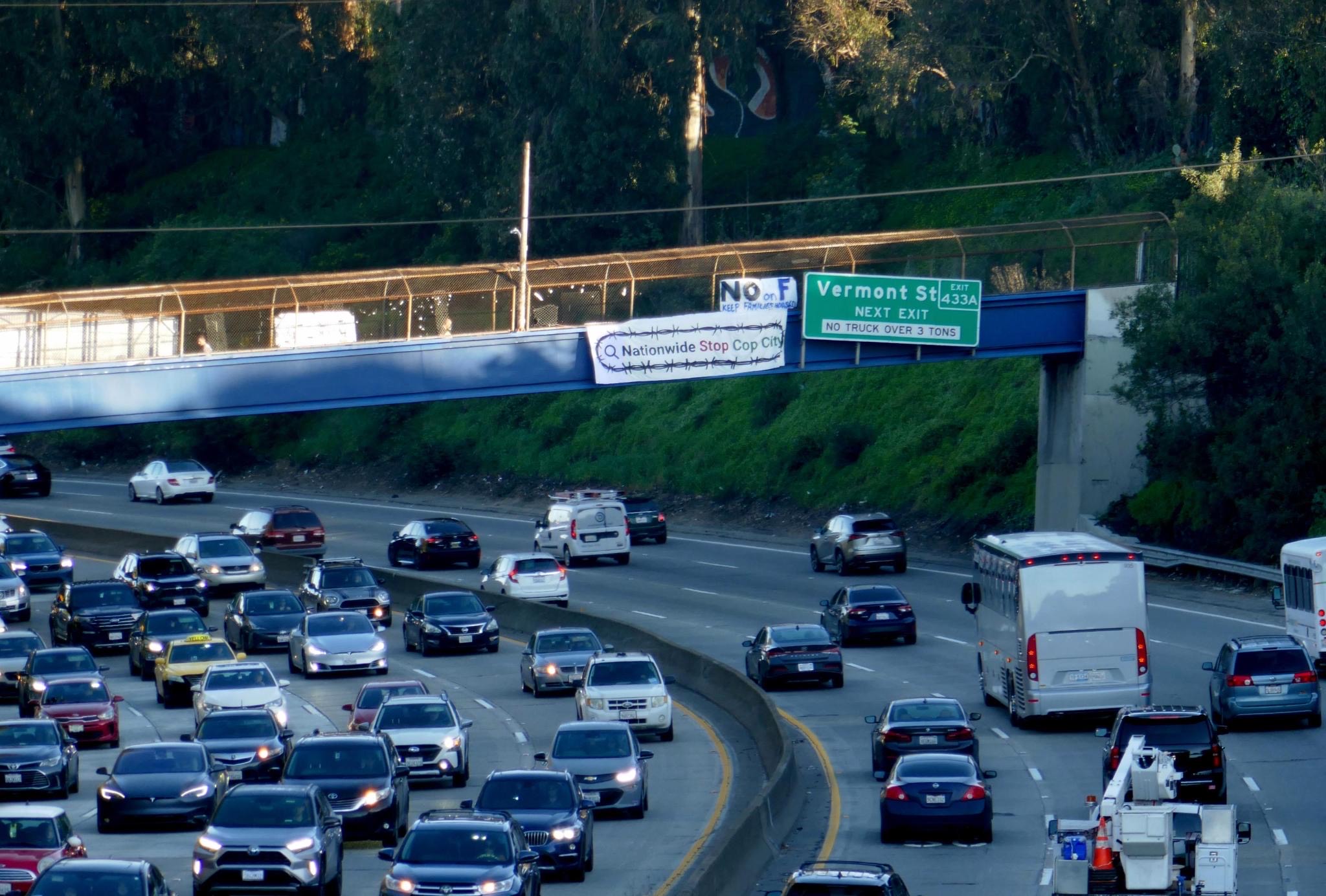 Organizers dropped a banner over the Vermont Street overpass calling for commuters to learn about the connection between Nationwide and Stop Cop City.