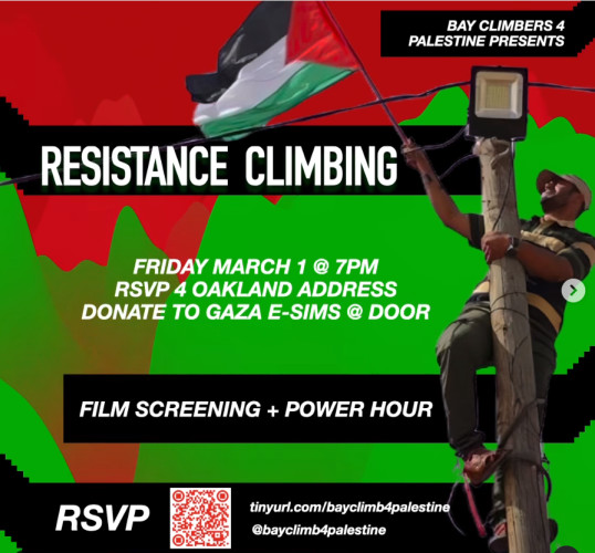 Join Bay Area Climbers for Palestine on Friday March 1 at 7pm for a screening of the documentary Resistance Climbing.