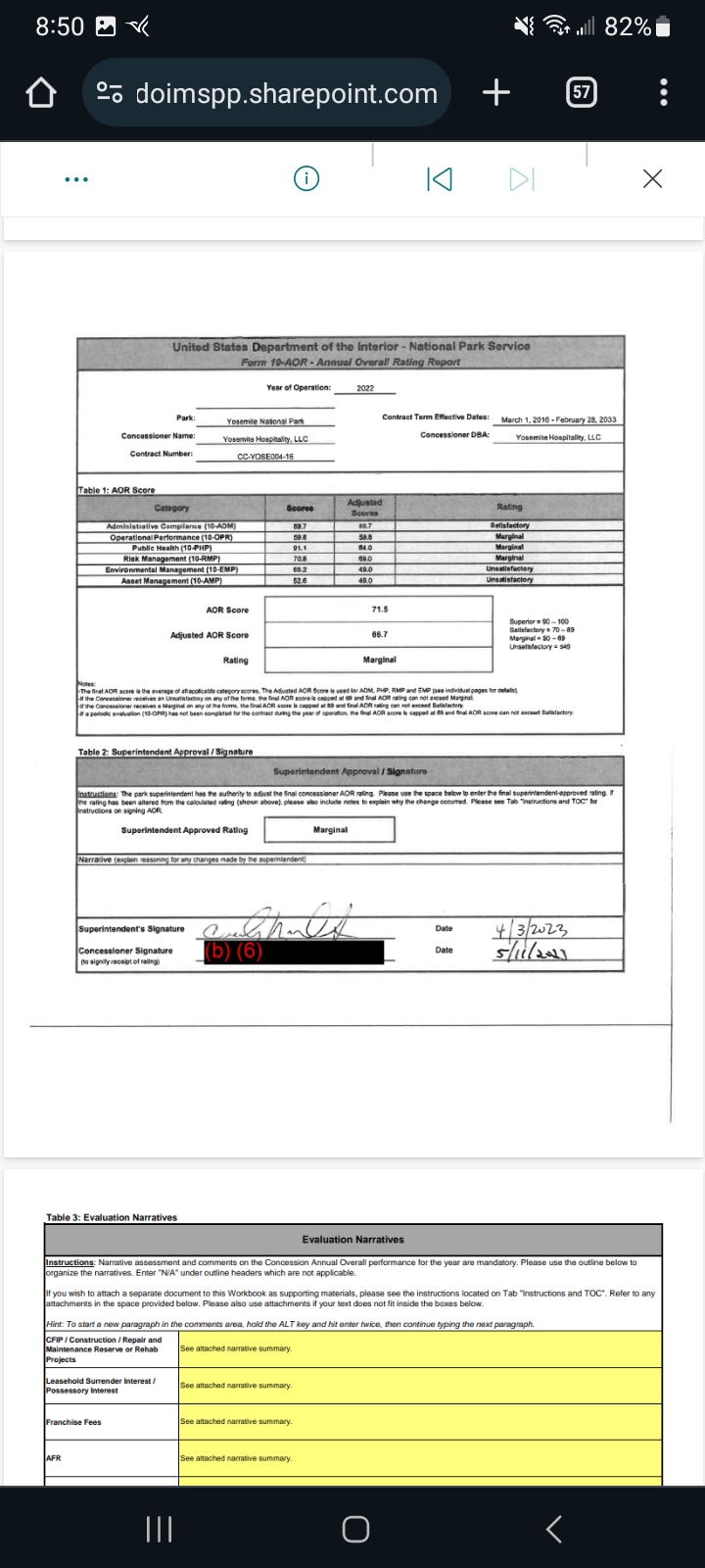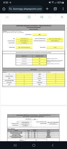 In 2022 Aramark at Yosemite, aka Yosemite Hospitality, received a Marginal score on the NPS's Annual Overall Rating(AOR) Report. The 2023 AOR has not been released yet.