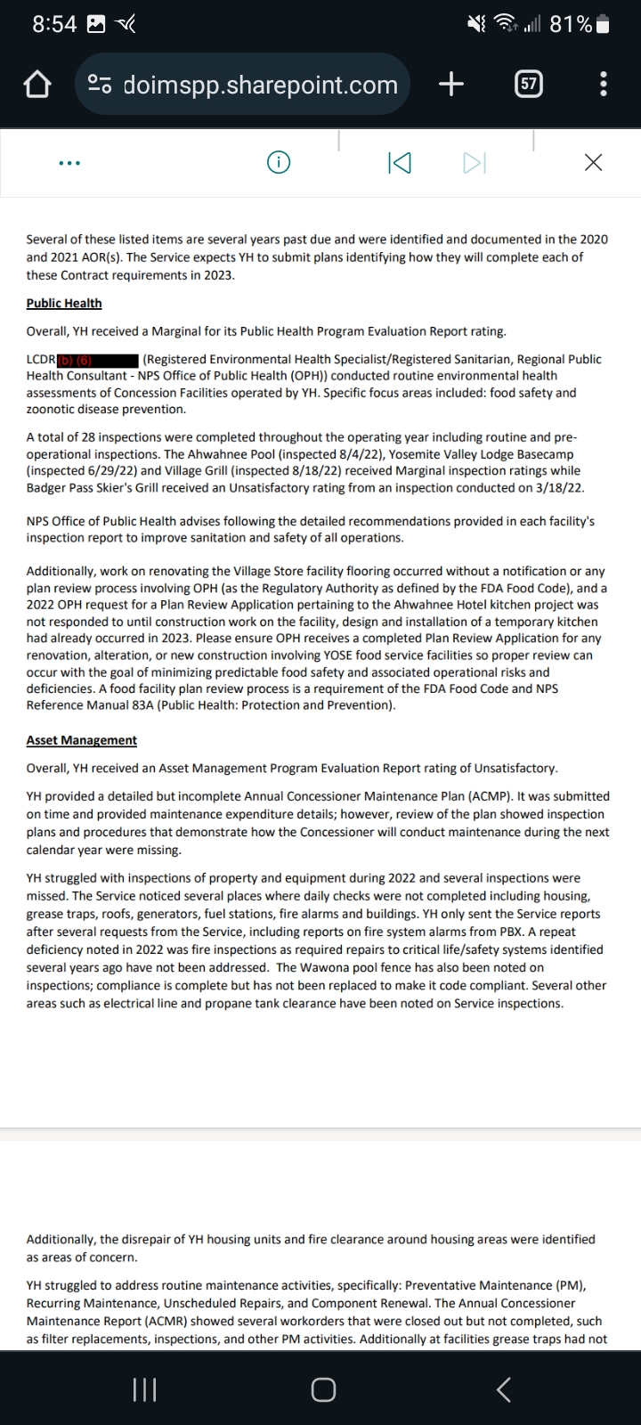 I am extremely concerned that issues documented by NPS in this AOR Report are just the tip of the iceberg as far as problems in Yosemite go. A good example of this is the fact that year in and year out, a majority of food service facilities do not seem to be getting even one Health Inspection. Meanwhile there have been multiple Noro Virus outbreak connected to these same facilities since Aramark has been in charge of the concessions Contract in Yosemite. As well as a constant pattern of Aramark not reporting major problems and then not fixing issues properly. Often leaving water damage and mold to such important facilities - Curry Village, the Ahwahnee, and the Lodge have all had issues like this in recent years. Aramark has not reported these issues and seems to have a major problem with fixing these ongoing maintenance issues.