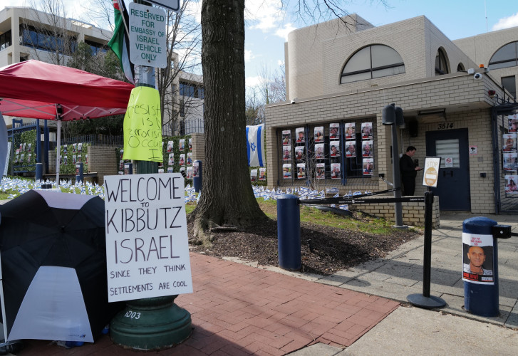 Calling their presence “Kibbutz Israel” along with a subtitle, “Since they think settlements are cool,” the activists have refused to leave knowing that if they do, the embassy will remove their “Kibbutz” along with the memorial. Standing by are several uniformed Secret Service officers to keep the peace in the area to eliminate any violence between the two sides.