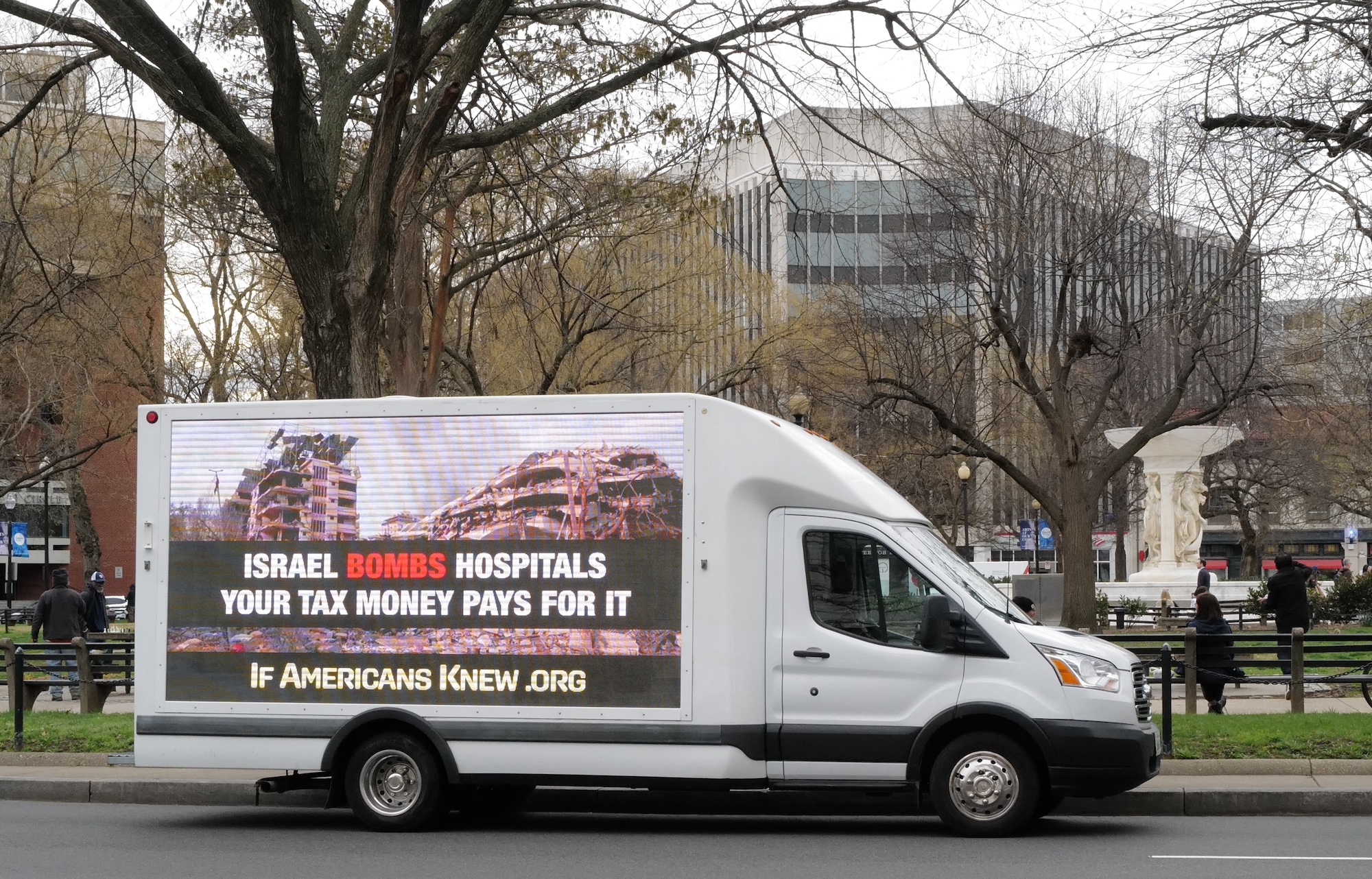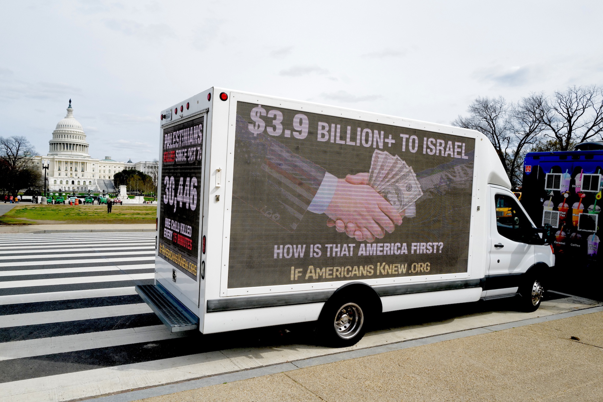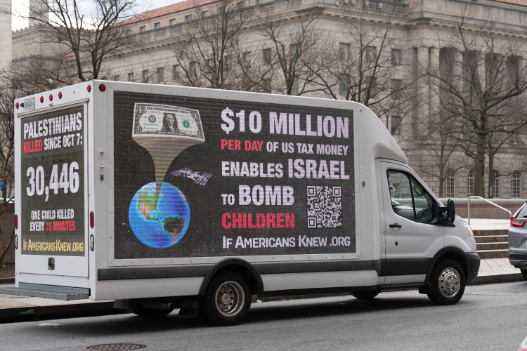 So, it is not surprising that for the past week two trucks each sponsored by separate groups have been displaying Gaza-related rotating messages calling on Americans to reconsider the cost to U.S. taxpayers of our support for Israel along with the effects of the genocide taking place in Gaza. Among the displays are those related to facts about what is happening on the ground in Gaza while calling for an end to stop bombing children and hospitals.