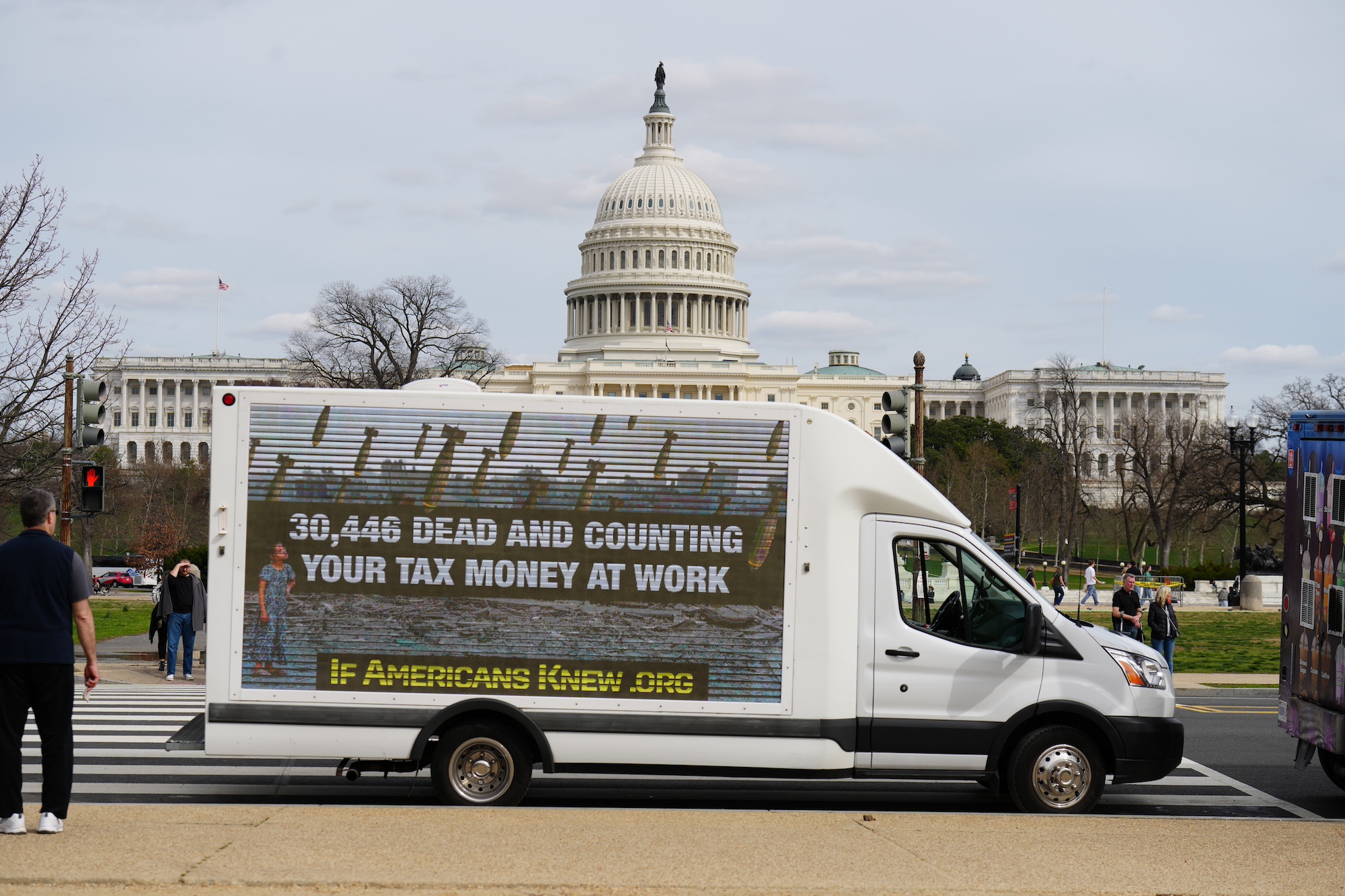 One such sign displayed on a truck sponsored by IfAmericansKnew.org shows a young girl looking up at a sky filed with falling bombs whose message includes a frequently updated toll of those killed indicating how tax dollars are being spent aiding Israel.