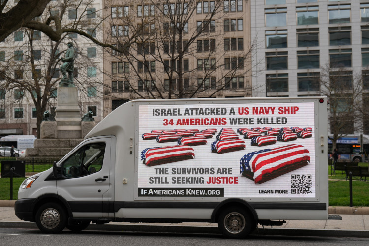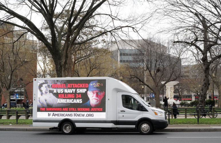 And if history is any judge of U.S.- Israeli relations in war zones, one of the mobile billboard reminds viewers of the tragic June 8, 1967 attack during the Six-Day War in which the USS Liberty, a lightly armored naval intelligence ship was attacked in international waters during daylight in a combined Israeli aerial and naval assault on the ship in which 34 sailors were killed and 174 were wounded.