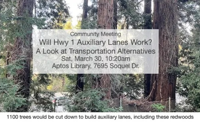 However, the proposed solution, adding auxiliary lanes (exit-only lanes) will not reduce congestion. We know that from experience (the auxiliary lane between Morrissey and Soquel finished in 2013 and didn't relieve congestion). Even the Caltrans Environmental Impact Report (EIR) predicts that the latest proposal to add auxiliary lanes in Aptos will not reduce congestion beyond the short term in the southbound afternoon peak. And the EIR says congestion will be worse in the northbound morning commute once the project is finished.
