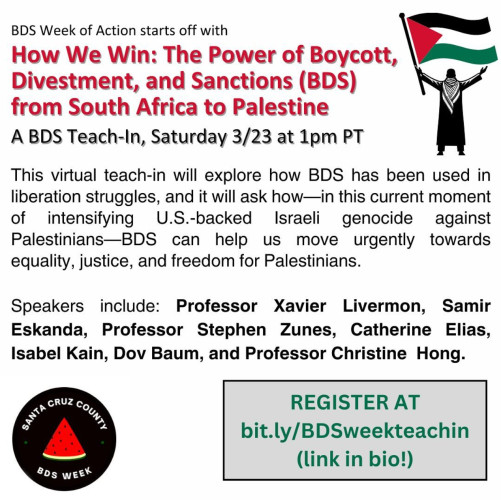 The first day of our BDS week of action features a virtual BDS teach-in entitled, “How We Win: The Power of Boycott, Divestment, and Sanctions (BDS) in Liberation Struggles from South Africa to Palestine,” on Saturday 3/23 at 1pm PT!