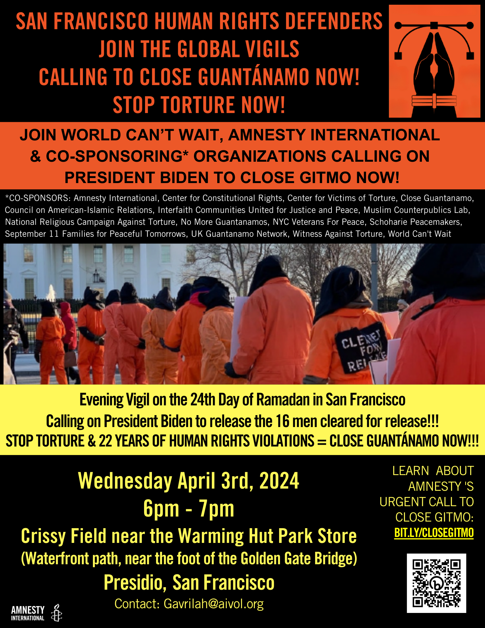 This month's SF vigil is inspired by the artwork of Guantánamo detainees (https://www.artfromguantanamo.com/new-catalog-images/sz532akia9fr4adofp0f4eyyt1t0cl) and in observance of Ramadan. With orange jumpsuits (provided) on site and the Golden Gate Bridge providing a striking backdrop, we will photograph a tableau of resistance to the horrors of the torturous prison, once described by Irene Khan (former Amnesty Secretary General) as "the gulag of our times."