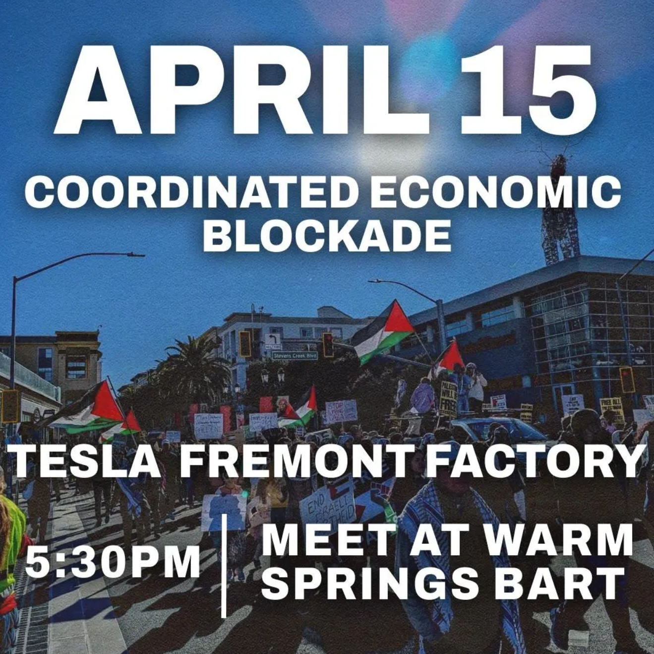 The Tesla Fremont Factory is one of the largest manufacturing employers in CA and the most productive automobile manufacturer in the country, making it a major point of production in the amerikkkan economy which is both fueling and profiting off of genocide in Gaza. At the same time, Tesla (which uses minerals mined in the DRC for EV rechargeable batteries) is deeply complicit in ongoing genocide in the Congo, where global demand for the land's riches has driven forced child labor, environmental destruction, and militia violence.