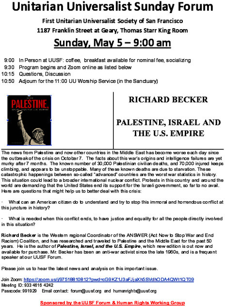 Richard Becker is the Western regional Coordinator of the ANSWER (Act Now to Stop War and End Racism) Coalition, and has researched and traveled to Palestine and the Middle East for the past 50 years. He is the author of Palestine, Israel, and the U.S. Empire, which new edition is out now and available for purchase. Mr. Becker has been an anti-war activist since the late 1960s, and is a frequent speaker at our UUSF Forum.