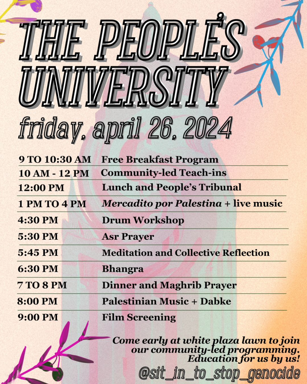 The People’s University for Palestine is now in White Plaza. We offer alternative programming in resistance to Stanford’s Admit Weekend for all students and prospective frosh to join as we stand in solidarity with the Palestinian people.