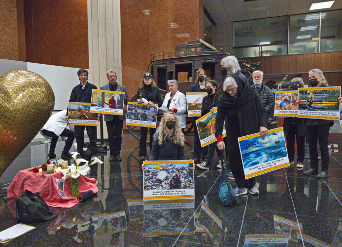 (San Francisco, April 24) - Seven local activists were arrested today for occupying the lobby of Wells Fargo branch at 464 California Street, after 30 concerned citizens conducted a solemn vigil to highlight the disconnectedness of environmental injustices and financial misconduct.The vigil included a mournful choir calling out Wells Fargo’s complicity in climate chaos, interspersed with participants speaking the personal stories of individuals across the globe who are directly affected by the environmental offenses perpetrated by the bank. Participants shared these stories of loss, struggle, and resilience in the face of environmental degradation and corporate greed.