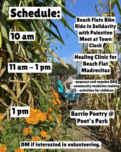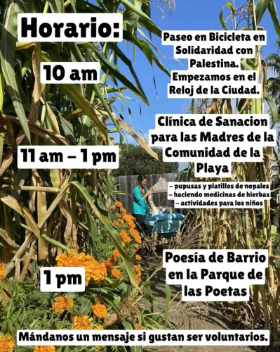 We are still seeking all volunteers: jardín clean up crew, healers (curanderxs, sobadores, doctores, parteras), musicians, herbalists, poets, chefs, everyone feeling called to support, please see volunteer registration in bio or DM. Also seeking bikes, food, herbal gifts, and any money donations to make this a beautiful celebratory for the whole community y sobretodo para las madres de las Flats who have suffered so much grief from the institutionalization our brown siblings and invisibility of our culture and our brilliance. We have no other spaces. We must preserve el jardín de la playa. Join our bike ride & poetry show, bring healing & medicine for our people.