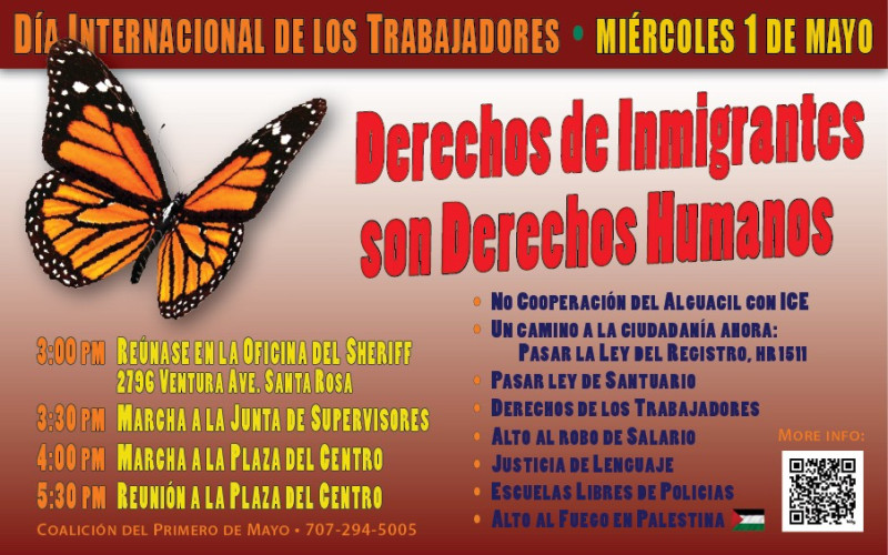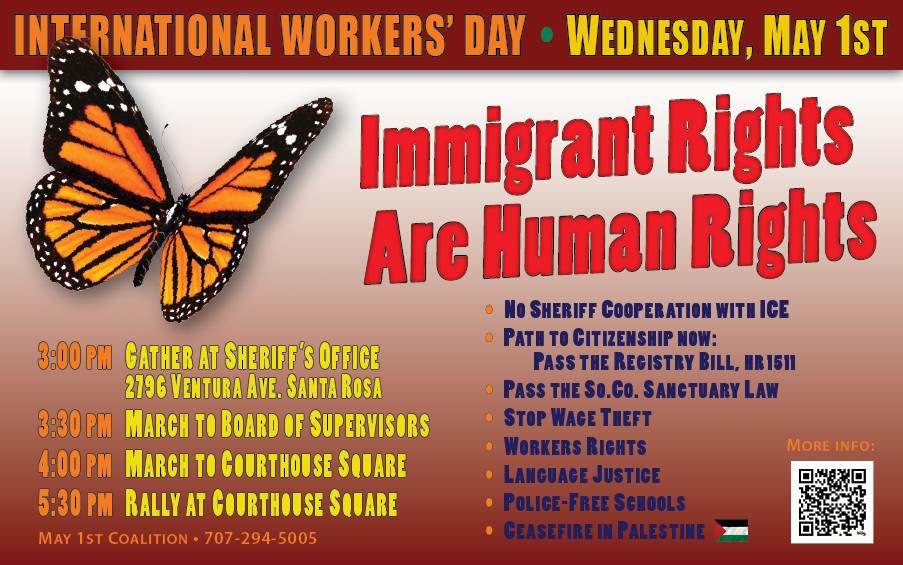On Wednesday, May 1, at 3 p.m., hundreds of Sonoma County community members, including many from the local migrant communities, will commemorate International Workers Day by marching for Immigrant Rights Are Human Rights.