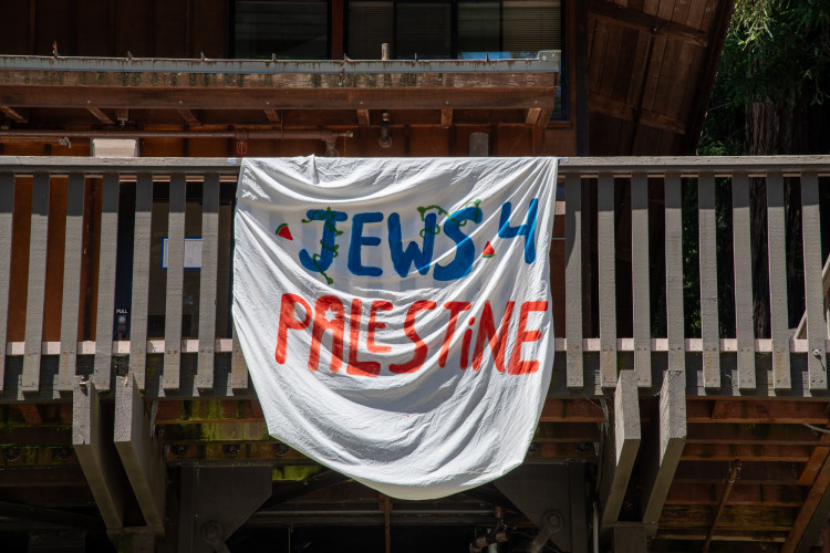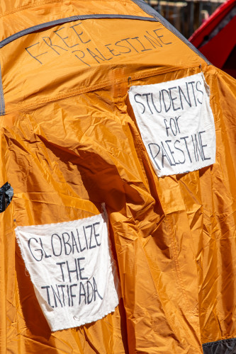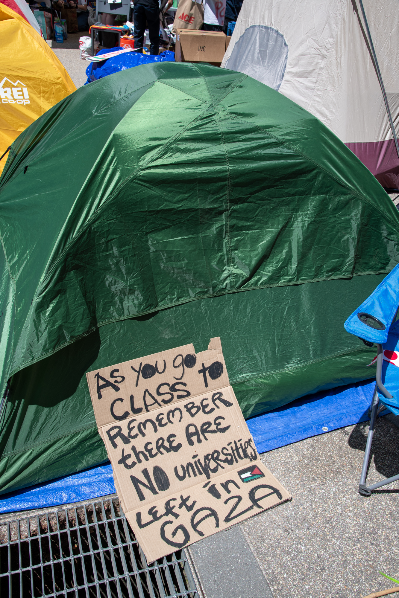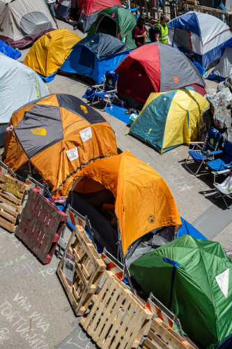 The Gaza solidarity encampment at UC Santa Cruz has grown significantly since it was established on May Day. Tents now stretch beyond the limits of Quarry Plaza. The mood at the camp was tranquil on the afternoon of May 3; groups of students participated in study groups on the Student Union decks as a teach-in was being held in front of Ivéta Cafe. Educational programming has been robust at the encampment, with full event schedules being posted daily by Students for Justice in Palestine.