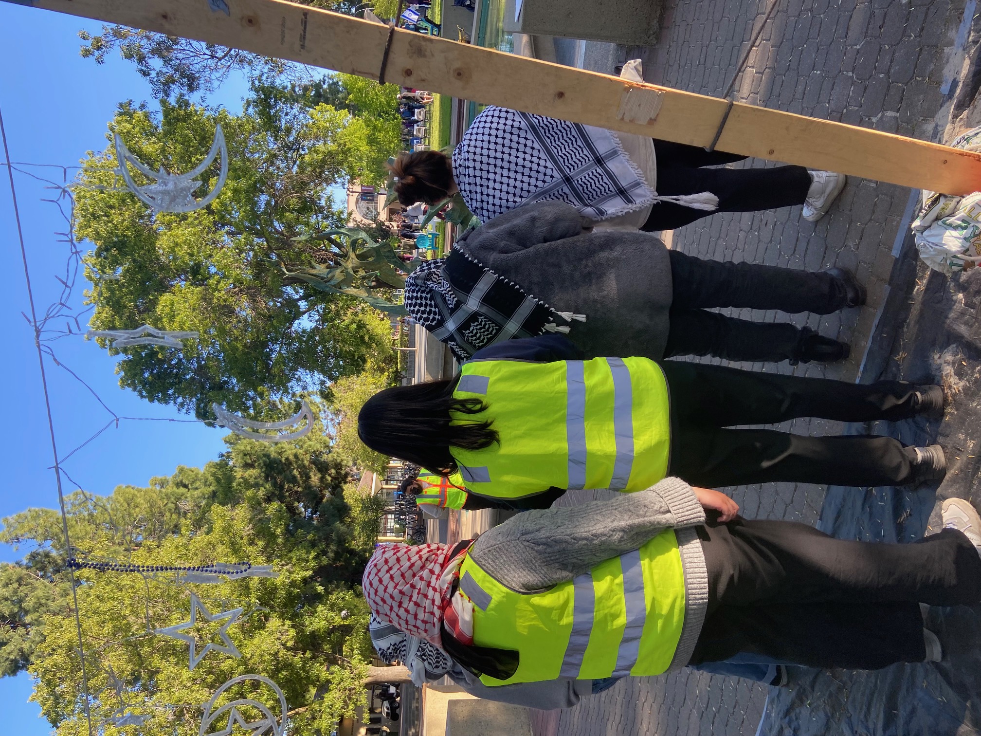 Community members affiliated with Vigil 4 Gaza, a group that protests regularly at an intersection near Stanford's entrance as well as in front of Palo Alto City Hall, provided a Palestinian meal for the encampment that evening. During the dinner hour students in keffiyeh could be seen looking across the plaza to where zionist students had set up symbolically empty white chairs and waved a couple of Israeli flags.