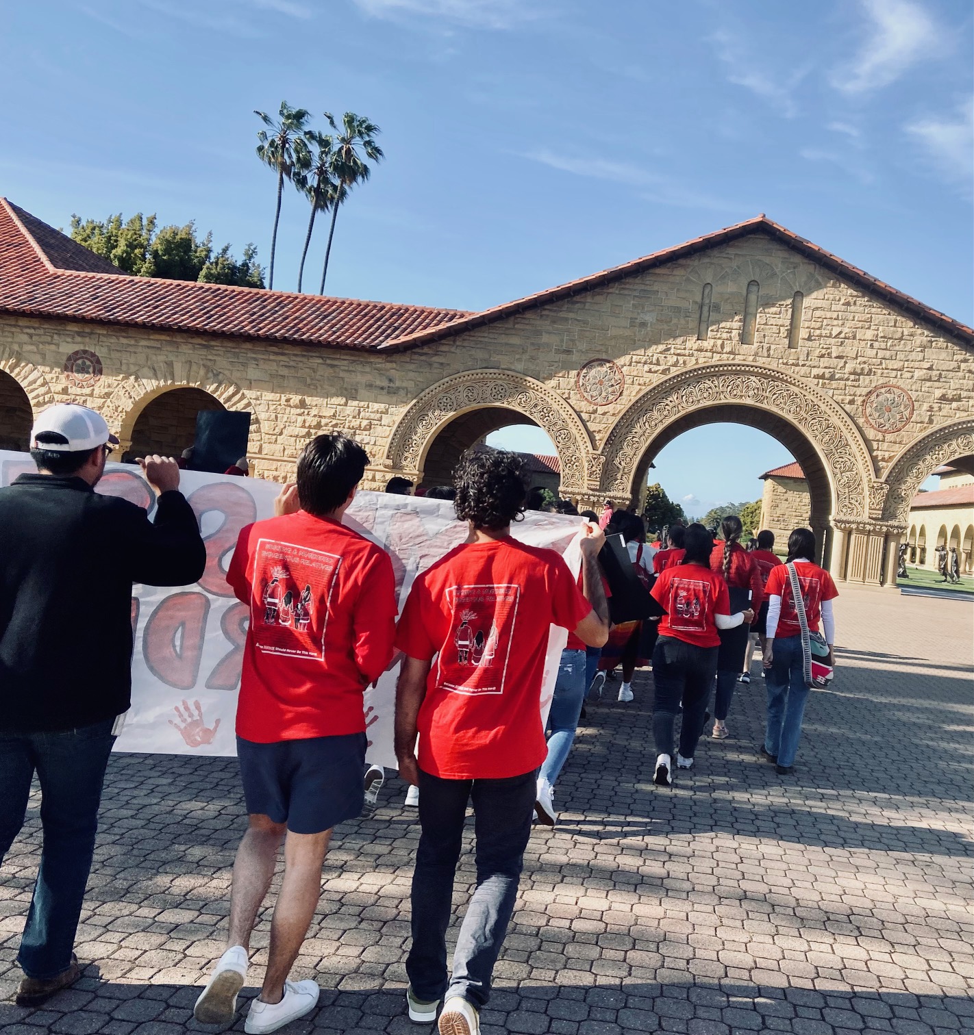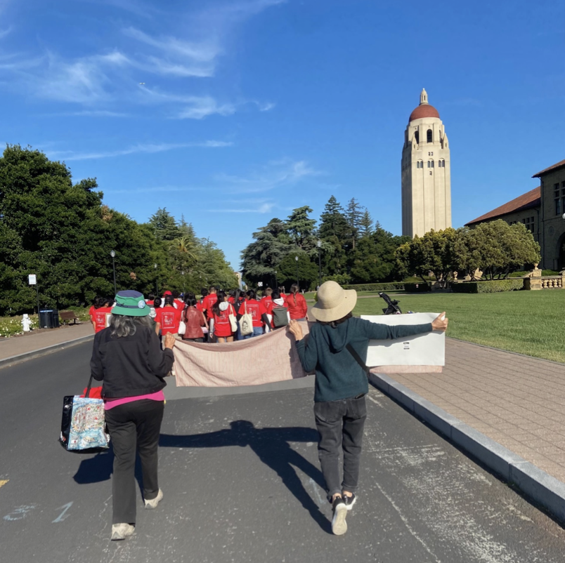 Every day since April 26, students have had a full day of programming at their encampment, the second they have erected since October 7, 2023. On May 5 another full day of activities included a march to stand in solidarity with indigenous communities who have missing relatives, victims of homicide/violence and their survivors. The Missing and Murdered Indigenous Relatives (MMIR) awareness event was led by the Stanford American Indian Organization. The Raging Grannies, an activist group of older women who support the student sit-in, brought up the rear of the march.