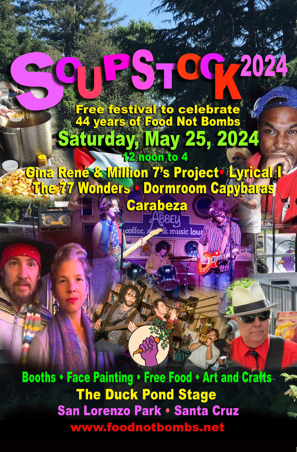 Free festival to celebrate 44 years of Food Not Bombs sharing food and friendship while organizing for peace and social justice.