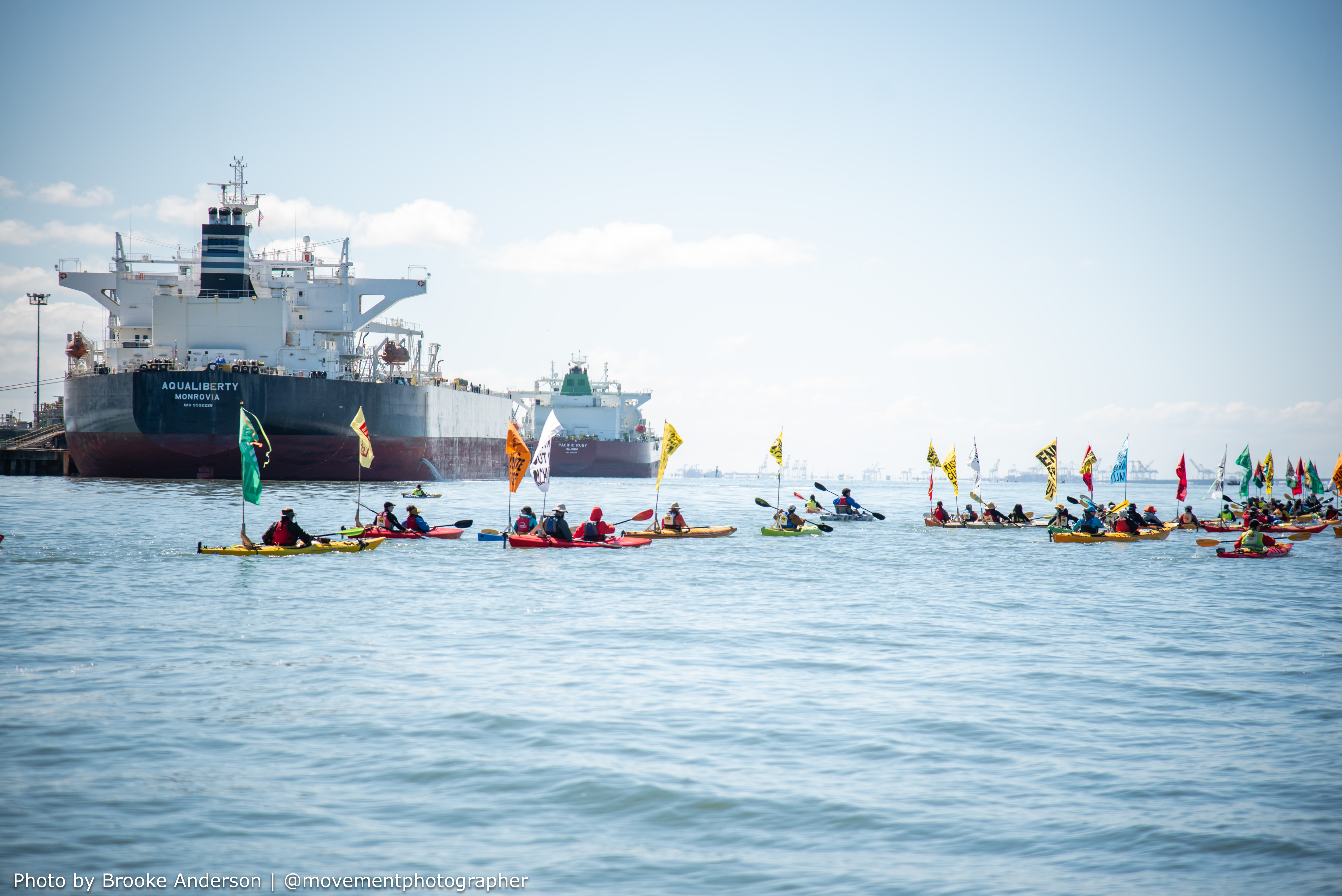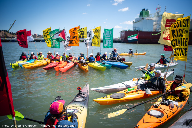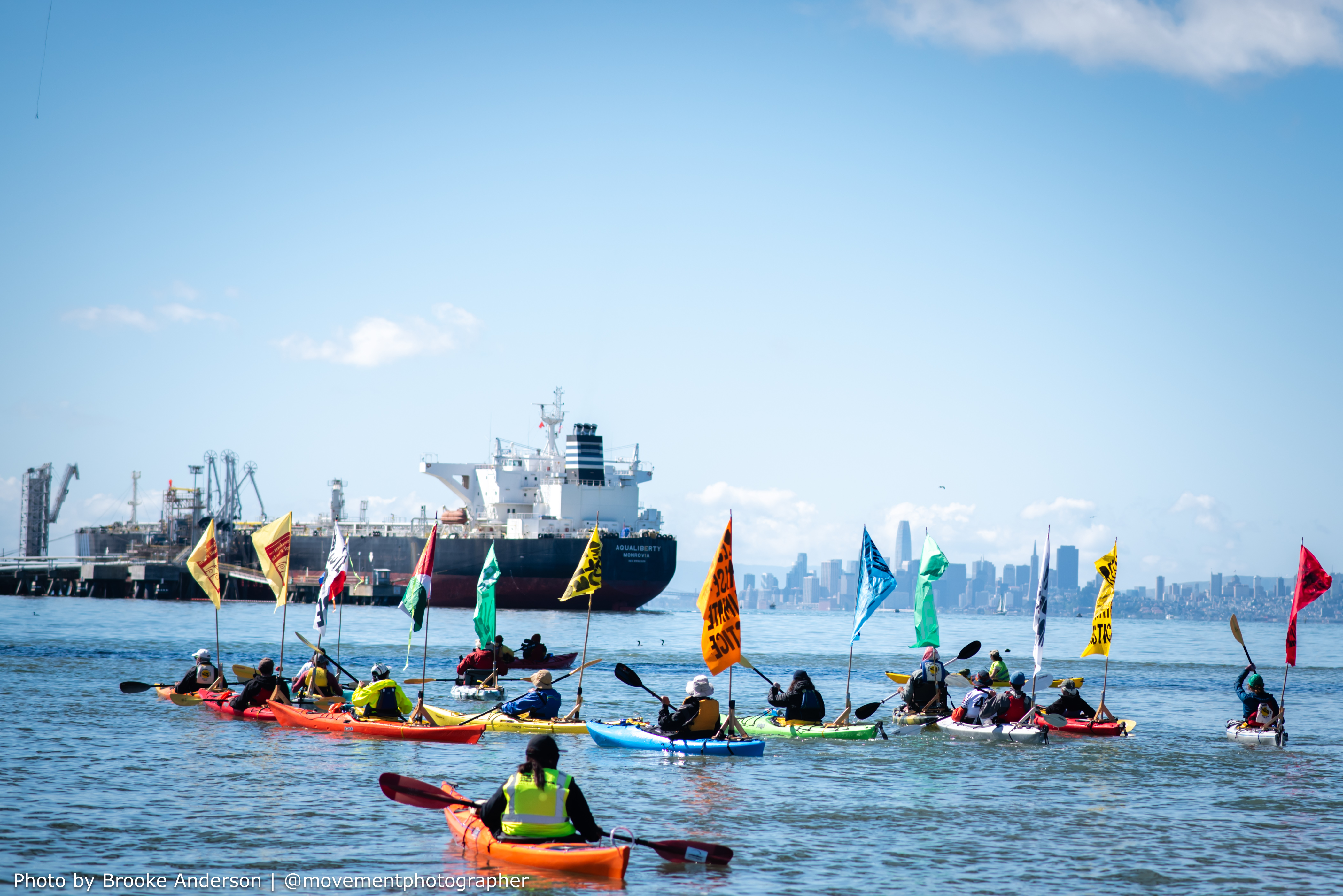 Today’s action was part of a global protest of Chevron’s brutal history of forcing low income communities of color to become frontline victims to environmental harm. This international revolution against Chevron pulses through Palestine, Ecuador, Myanmar and the Philippines. The kayaction held space for the international reality of the Anti-Chevron struggle, extending the focus beyond Richmond with flags from many nations.