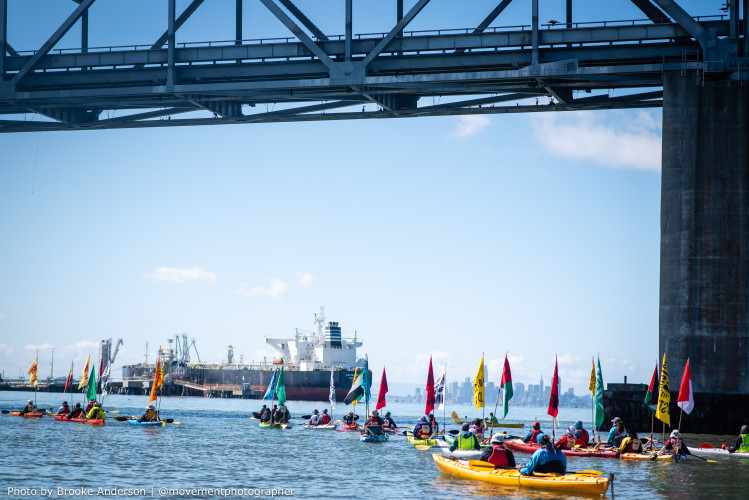 May 5th, 2024, Point Molate, Richmond, CA – The Rich City Rays, a young BIPOC centered organization based out of Richmond, California, took out a record 56 kayaks yesterday to continue to highlight the environmental and humanitarian consequences of Chevron’s Richmond Oil Refinery. Carrying flags and banners, the Rich City Ray kayakers went out on the waves with coinciding land events amplifying their calls.The kayaks paddled boldly into restricted waters, with "ABOLISH CHEVRON' signage, bannered across a raft of participants, and “temporarily blocked one of the ships,” reported Rays member Alfredo Angulo. A Coast Guard vessel was observed surveilling the action, but was effectively de-escalated and no arrests or harm came to the paddlers. The water event included offerings of flowers and song. As Cho Adolfo, member of the Rays told reporters, "We take back the water by creating space for joy.”