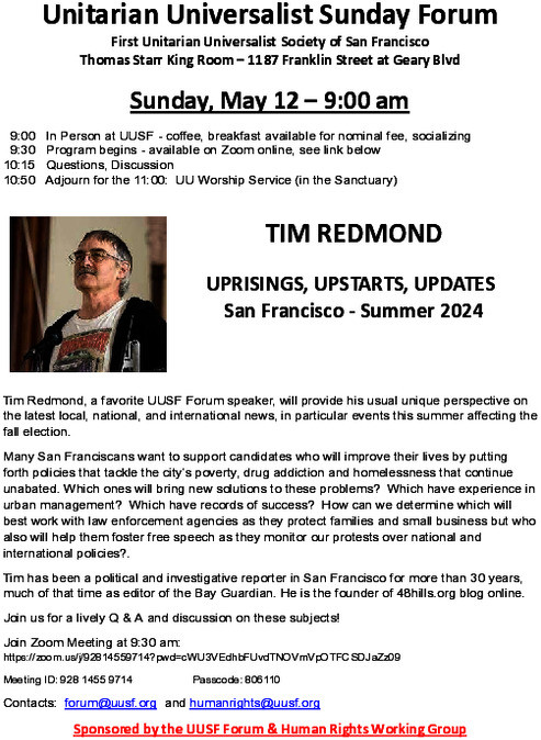 Tim Redmond, a favorite UUSF Forum speaker, will provide his usual unique perspective on the latest local, national, and international news, in particular events this summer affecting the fall election.