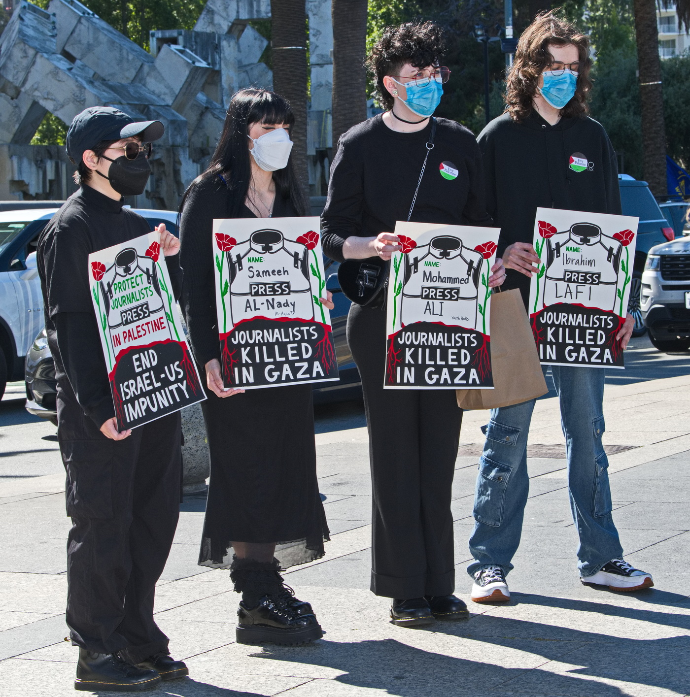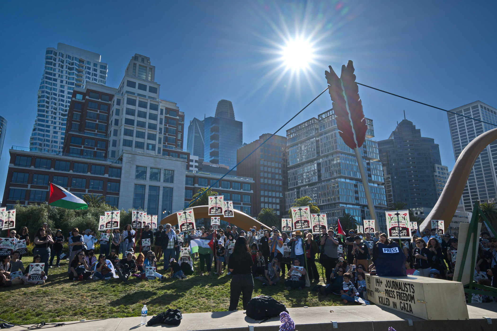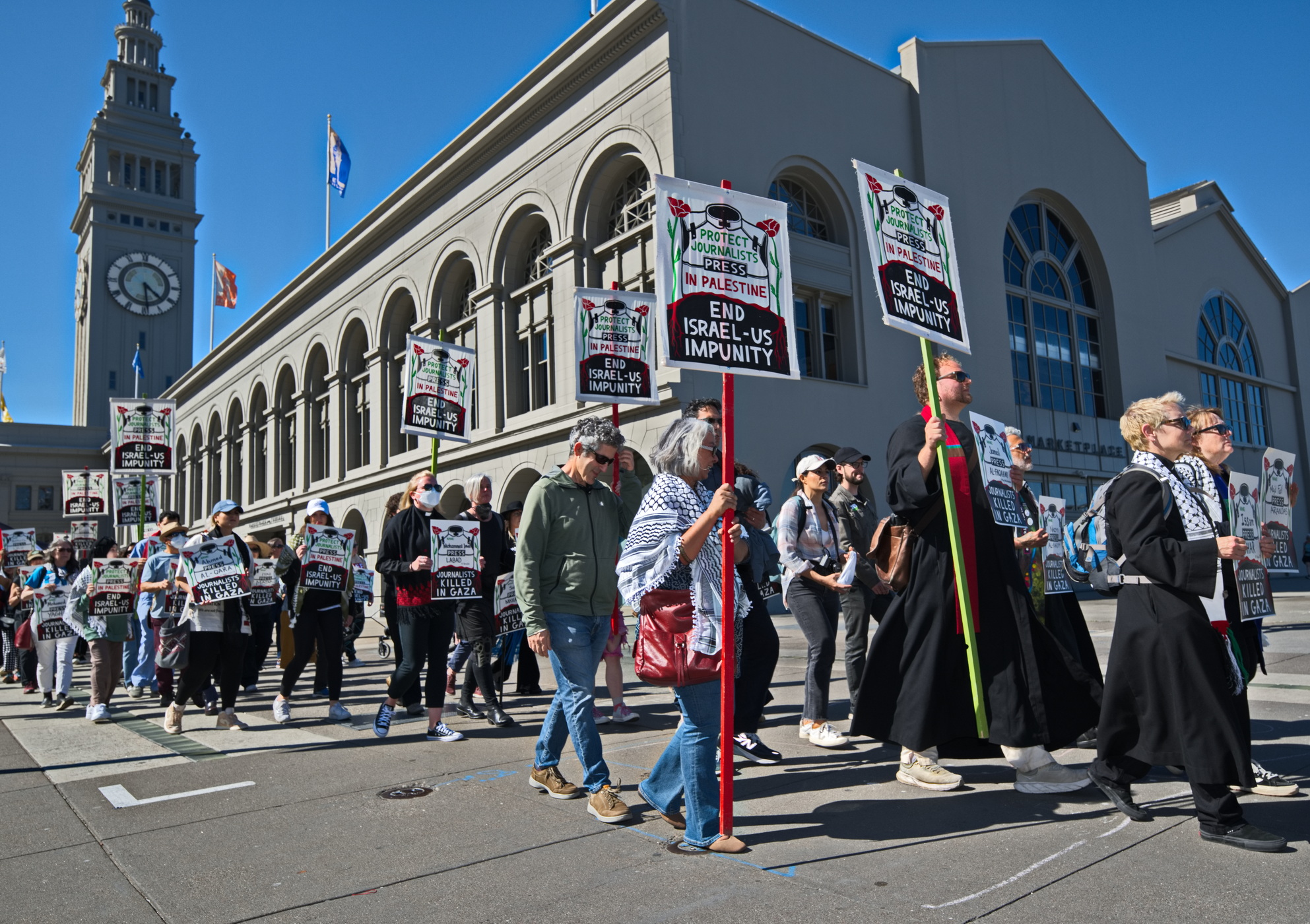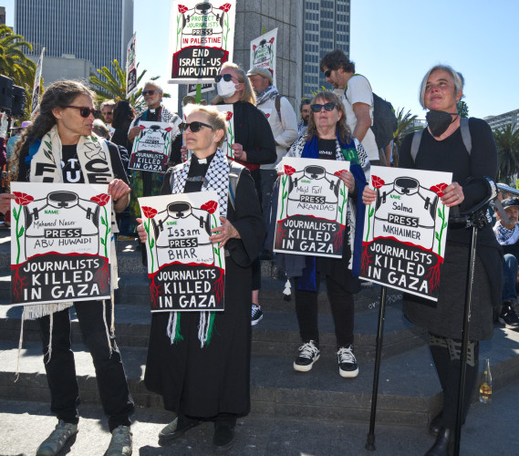 (San Francisco, May 11) - Shireen Abu Akleh was among the 141 Palestinian journalists targeted and killed by Israel as it pursues its goal of erasing the people and culture of Palestine.Organized by the Climate Justice Street Mural Arts Project, about three hundred participants assembled in Harry Bridges Plaza, directly in front of the Ferry Building. They made signs, including one each bearing the name of a murdered journalist. After several speeches, a procession that included several clerics walked to the "Cupid's Span" sculpture. There, a memorial ceremony honoring the memory of each slain journalist by name was held.