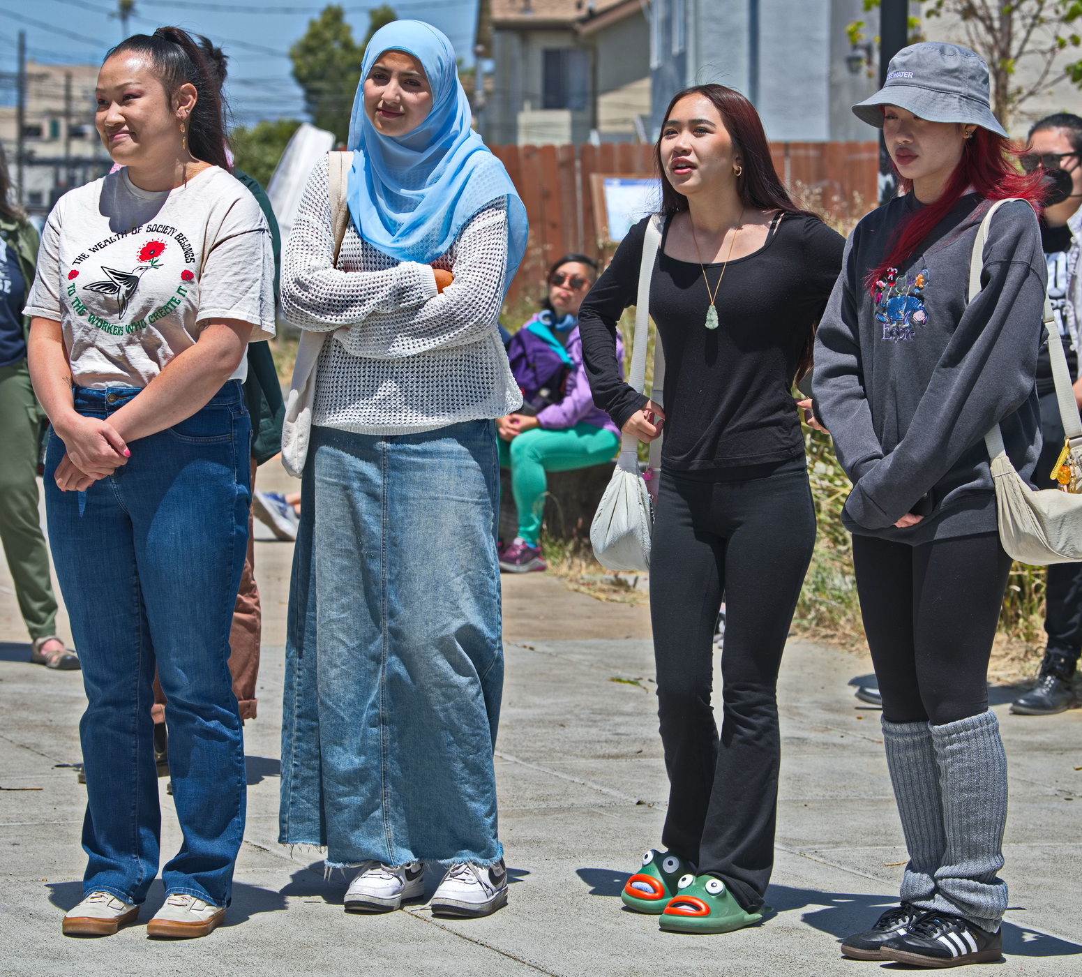 Snacks of rice and beans were provided. Street mural artist David Solnit, a regular in Bay Area protests, set up tables for painting gigantic signs. Many, from children to seniors,wielded paintbrushes.
