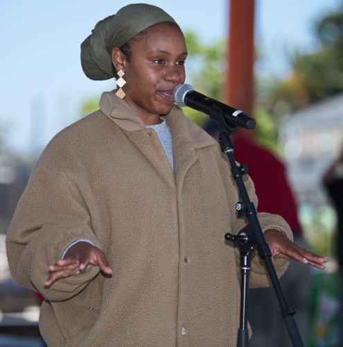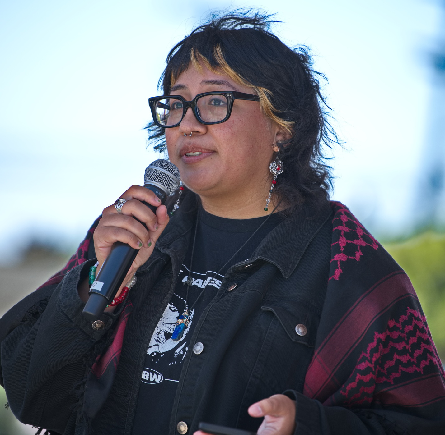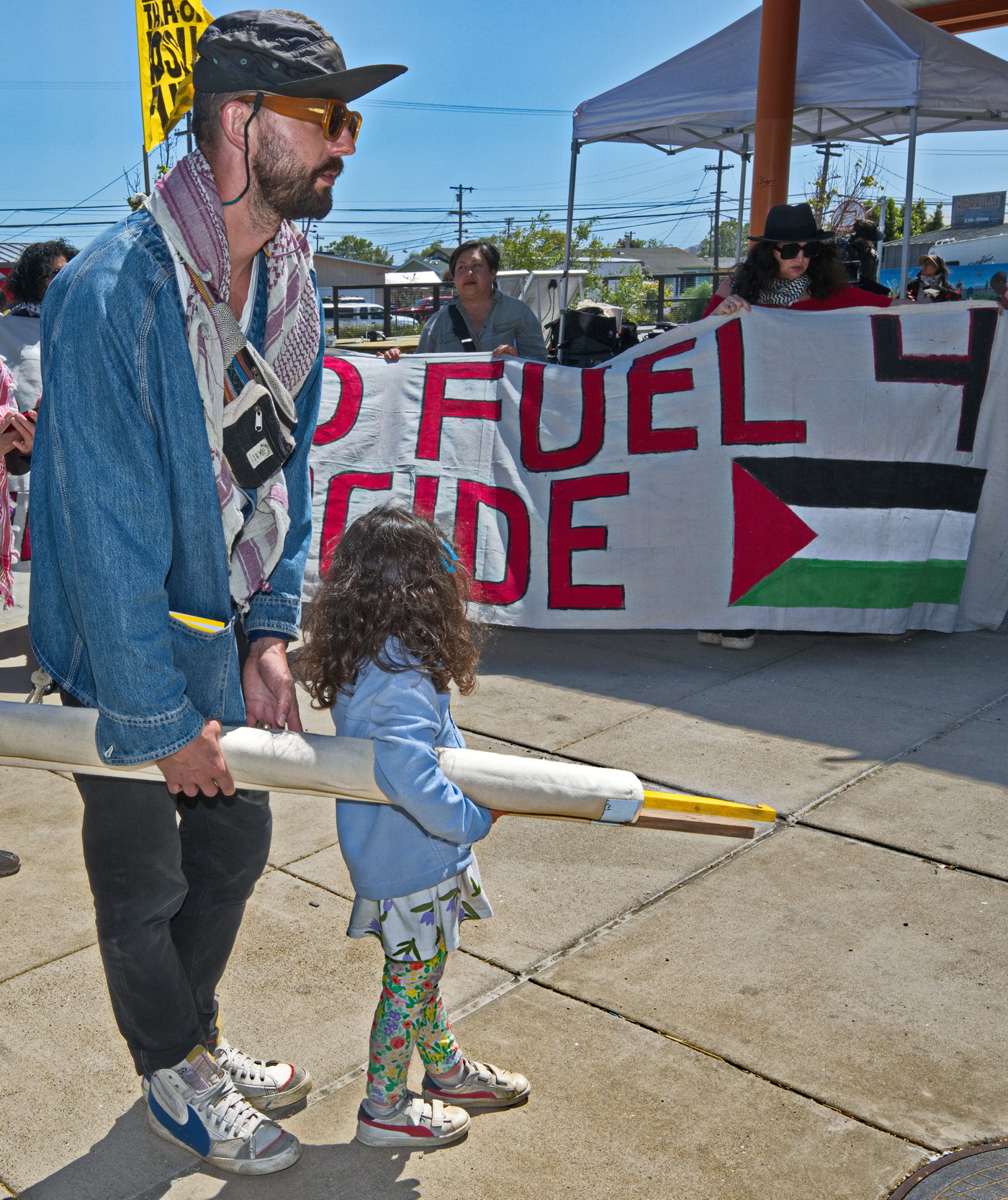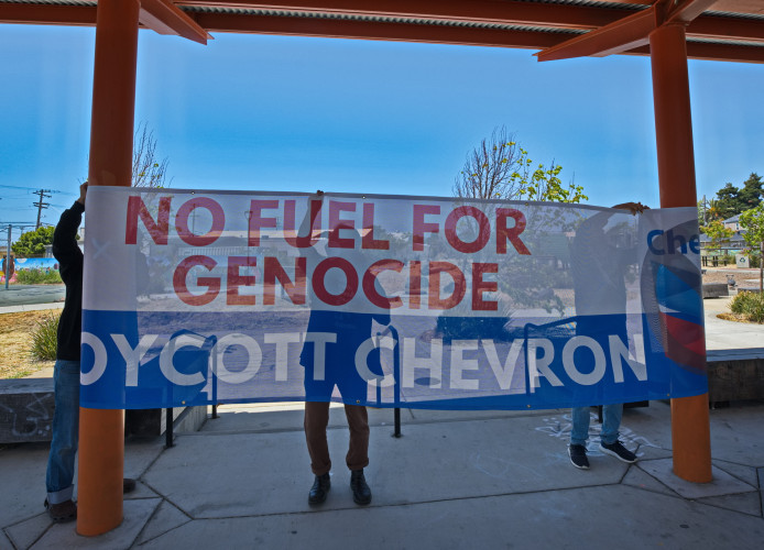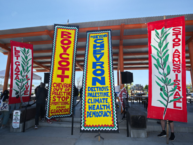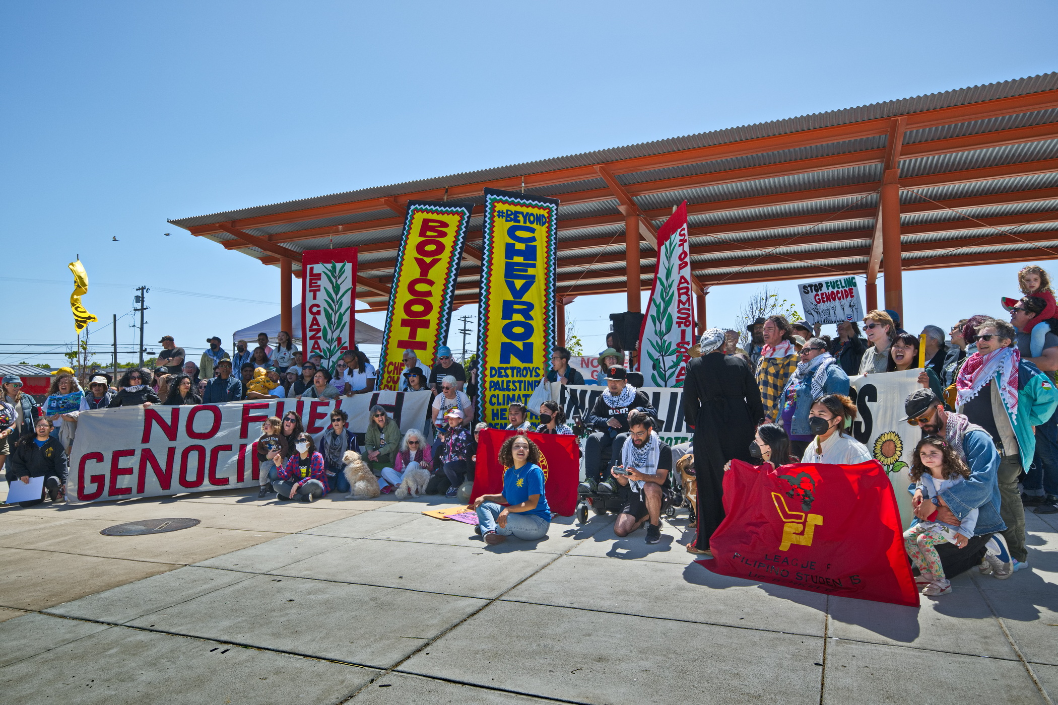 Speakers at the event including Richmond Mayor Eduardo Martinez and poets and musicians also addressed the crowd. Two themes were emphasized. First, that Chevron whose refinery is located in Richmond, has degraded the local air quality and inflicted high asthma rates on Richmond's children. Second, that Chevron is profiting from involvement in the Israeli-US genocide of Palestine.