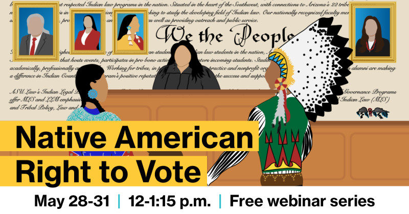 The Indian Legal Clinic at ASU Law is excited to host a webinar series, the Native American Right to Vote. Sessions for the free online series will be held on May 28-31 from 11 AM - 12:15 PM PT (noon - 1:15 PM MT) each day.