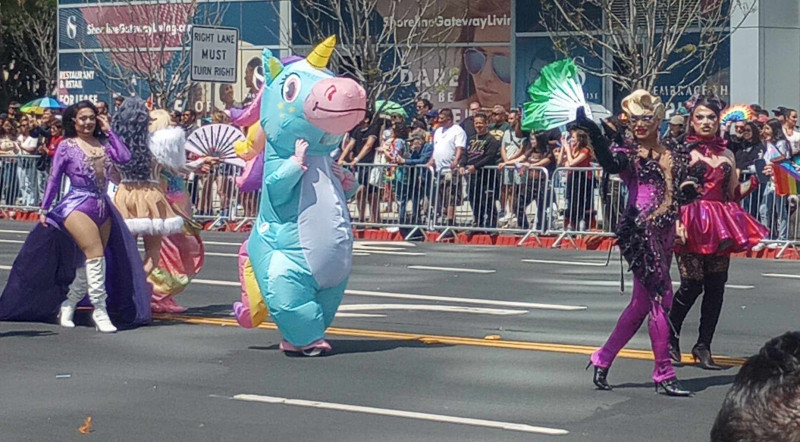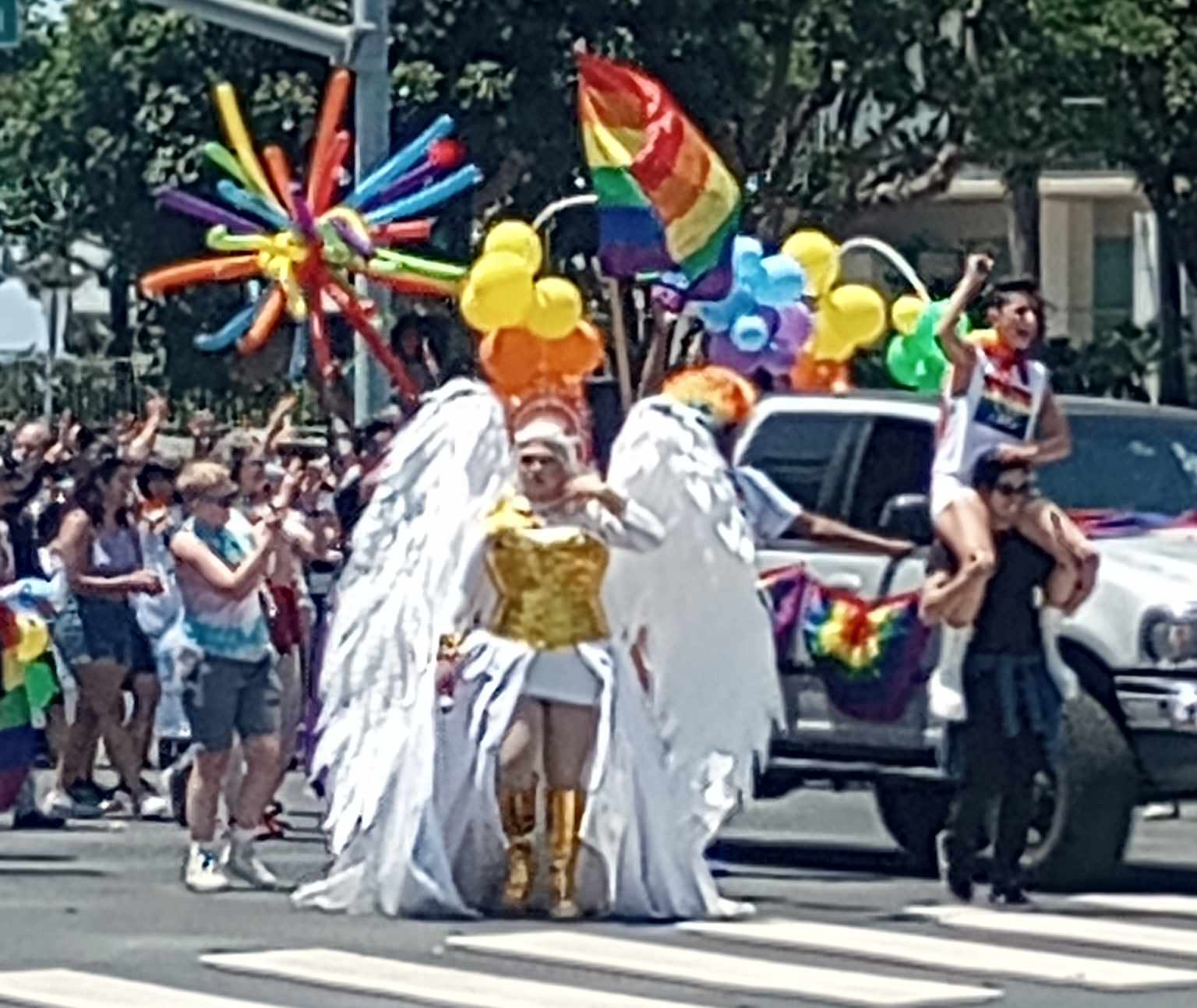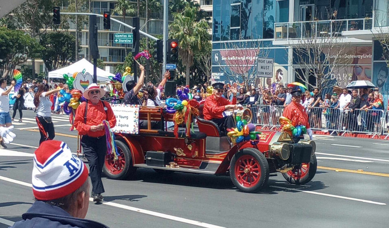 The 41st Pride Parade in Long Beach was generally a joyous occasion. But naturally, amid the party atmosphere was serious subjects like AIDS prevention/treatment, parents supporting their LGBTQ offspring, Planned Parenthood, and sobriety. There was also sponsorship by local businesses such as Hamburger Mary's as well as corporations including Disneyland, Walmart, Boeing, Gelson's, and major banks. But attention was also drawn by to Palestine (apparently by unaffiliated activists). See video at very bottom of article/pix.