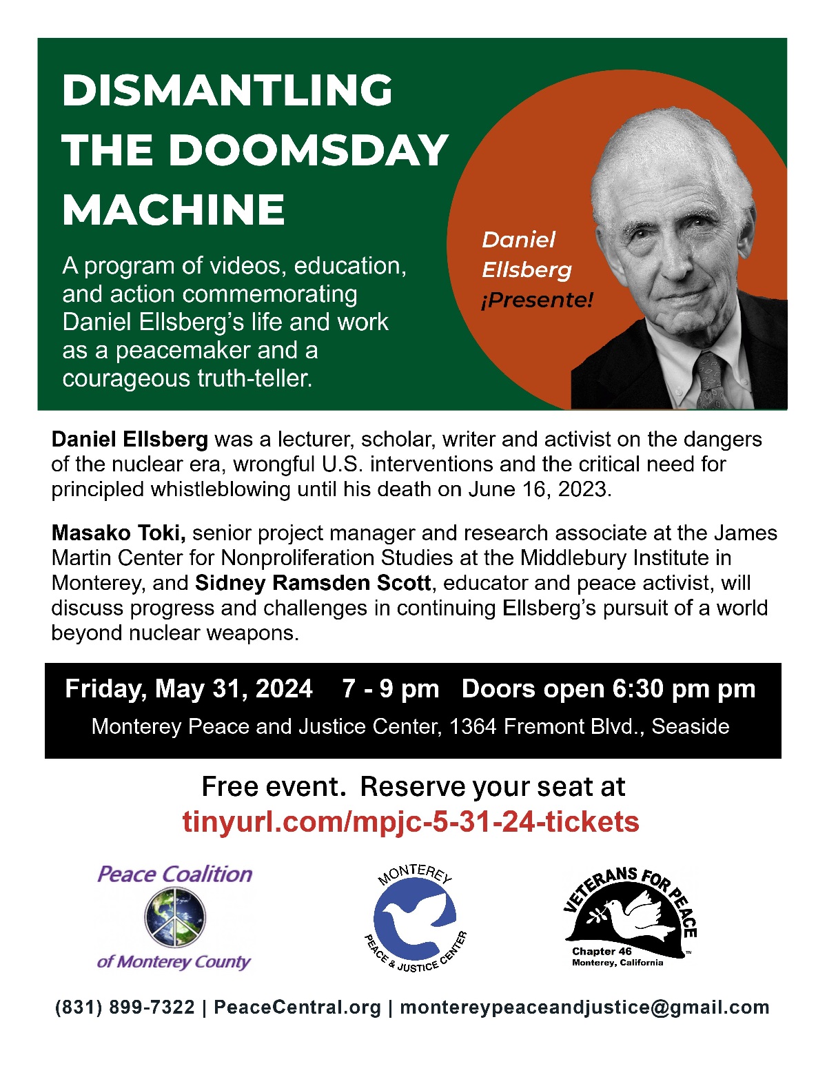 Come join us for an enlightening evening commemorating Daniel Ellsberg’s life and work as a peacemaker and courageous truth-teller. This program of videos, education, and action will be held at the Monterey Peace and Justice Center, 1364 Fremont Blvd., in Seaside, CA. Doors open at 6:30 pm.