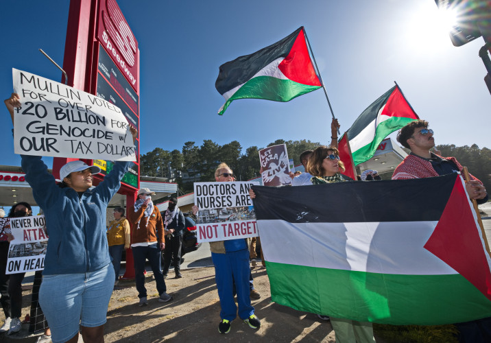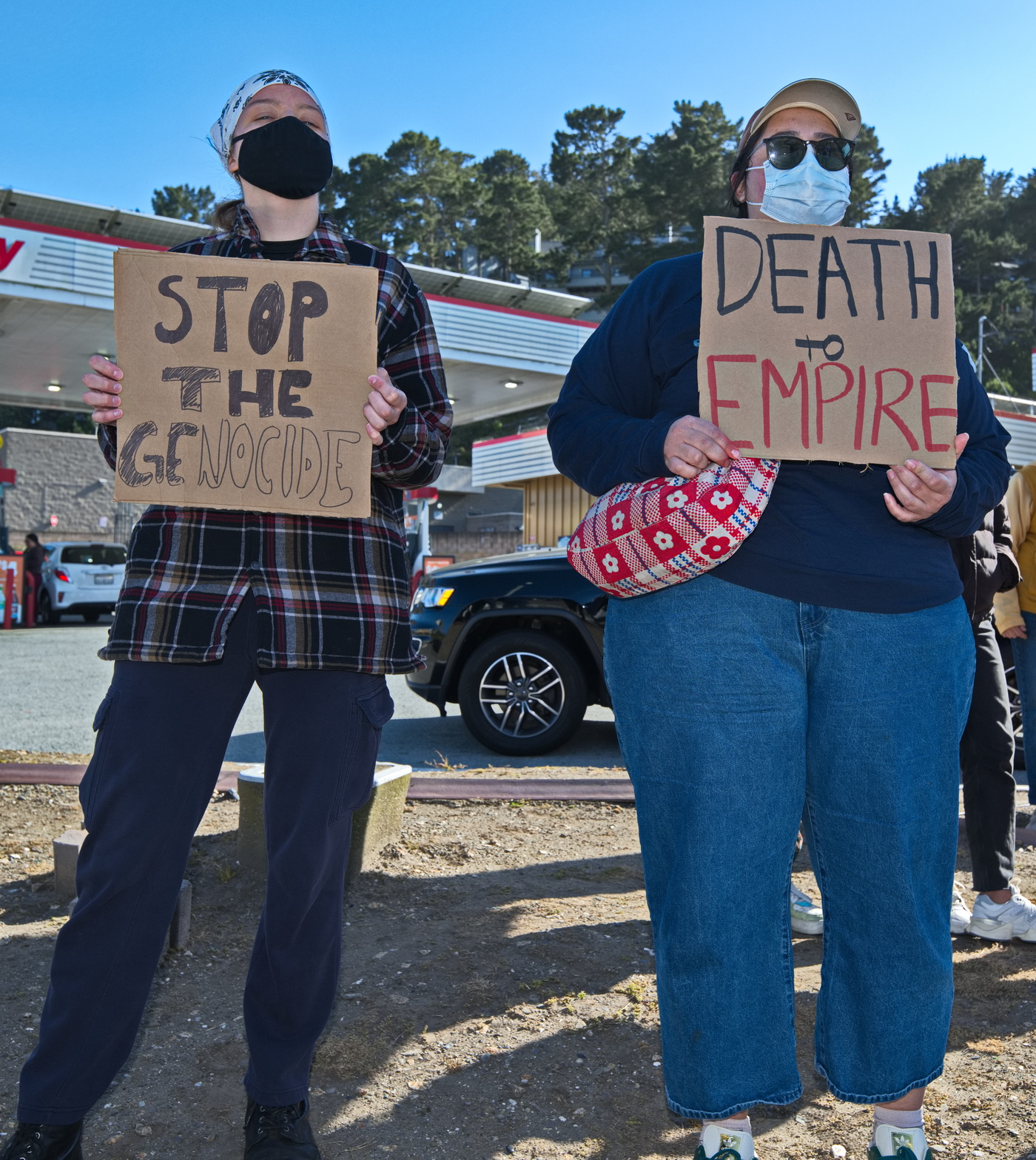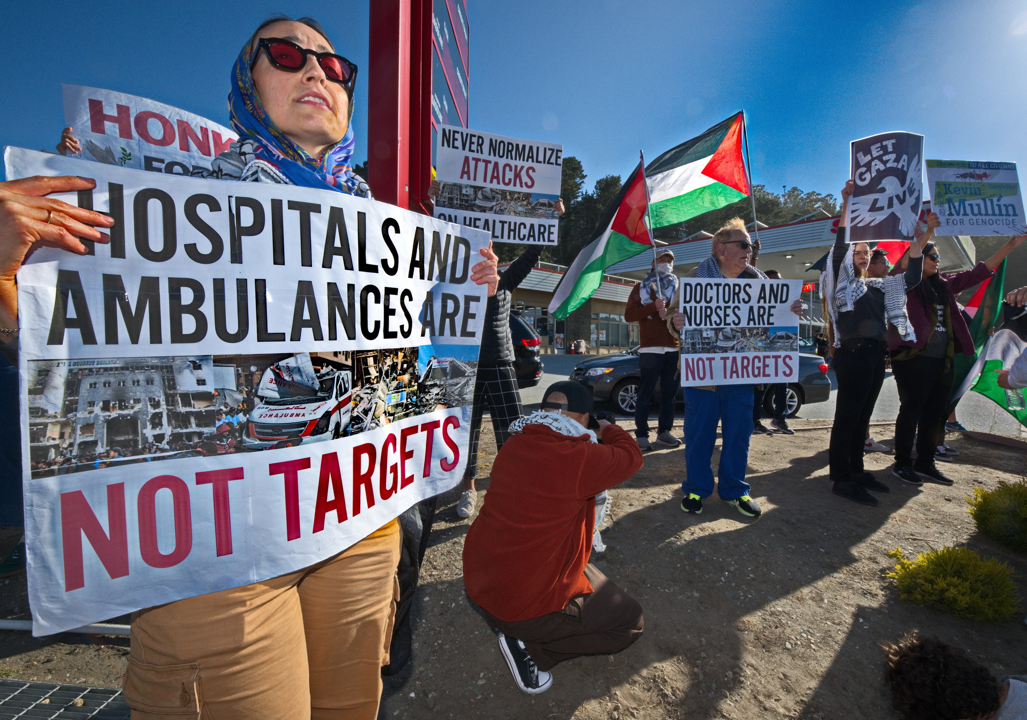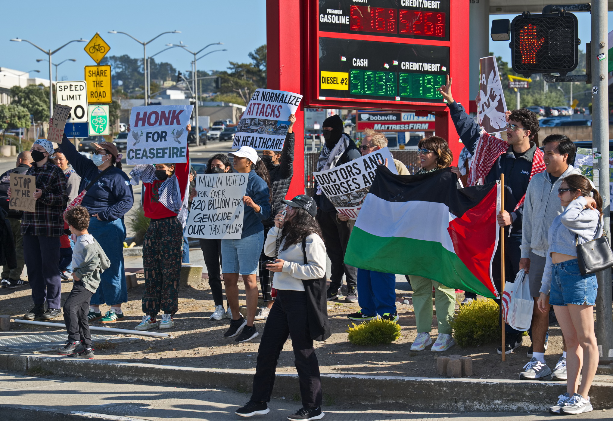 Several demonstrators displayed signs blasting Rep. Kevin Mullin for voting to fund the genicde with us tax dollars.
