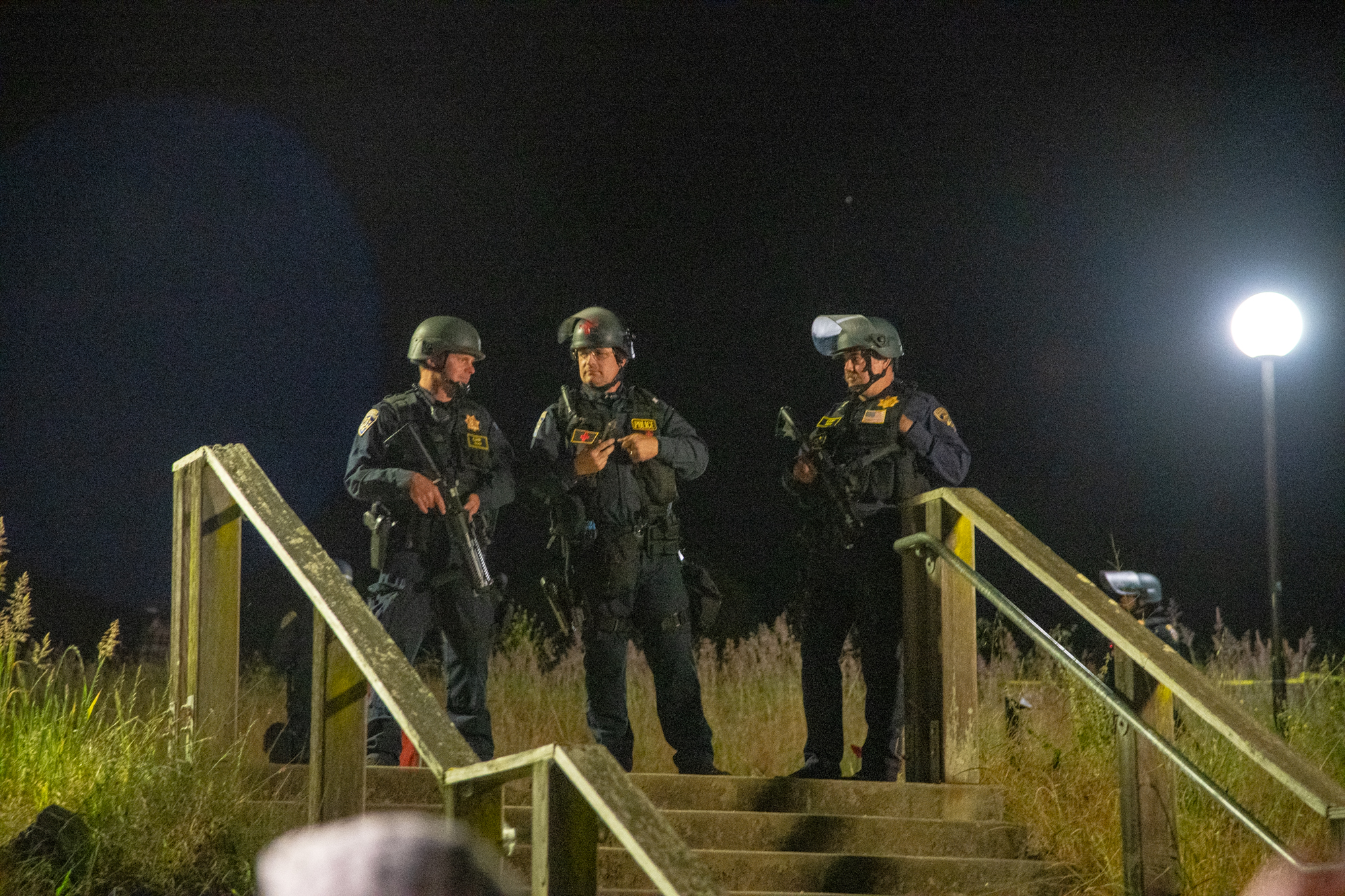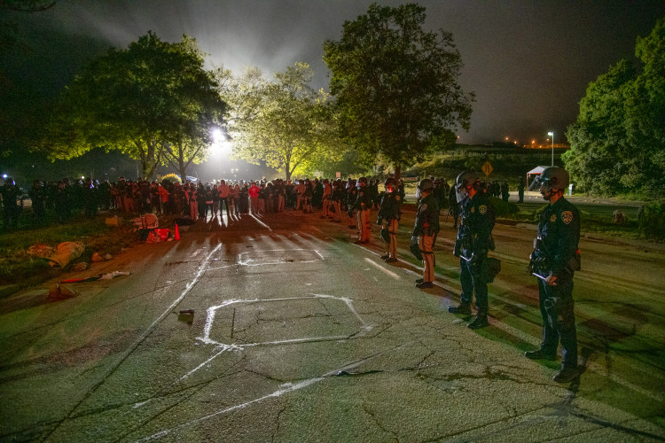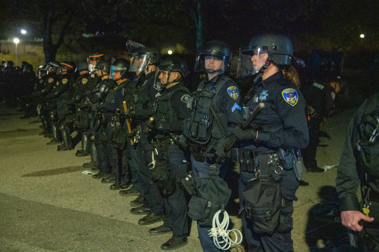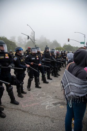 Shortly after midnight on May 31, riot cops from multiple agencies descended on UC Santa Cruz in order to remove the Gaza Solidarity Encampment established by Students for Justice in Palestine. For the first hour of the police presence, officers cordoned off the area surrounding the encampment. Students then grouped closely together and locked arms near a blockaid they created on May 28 to prevent traffic from entering the main entrance to campus. Throughout the evening and into the morning there were hundreds of riot cops on campus.