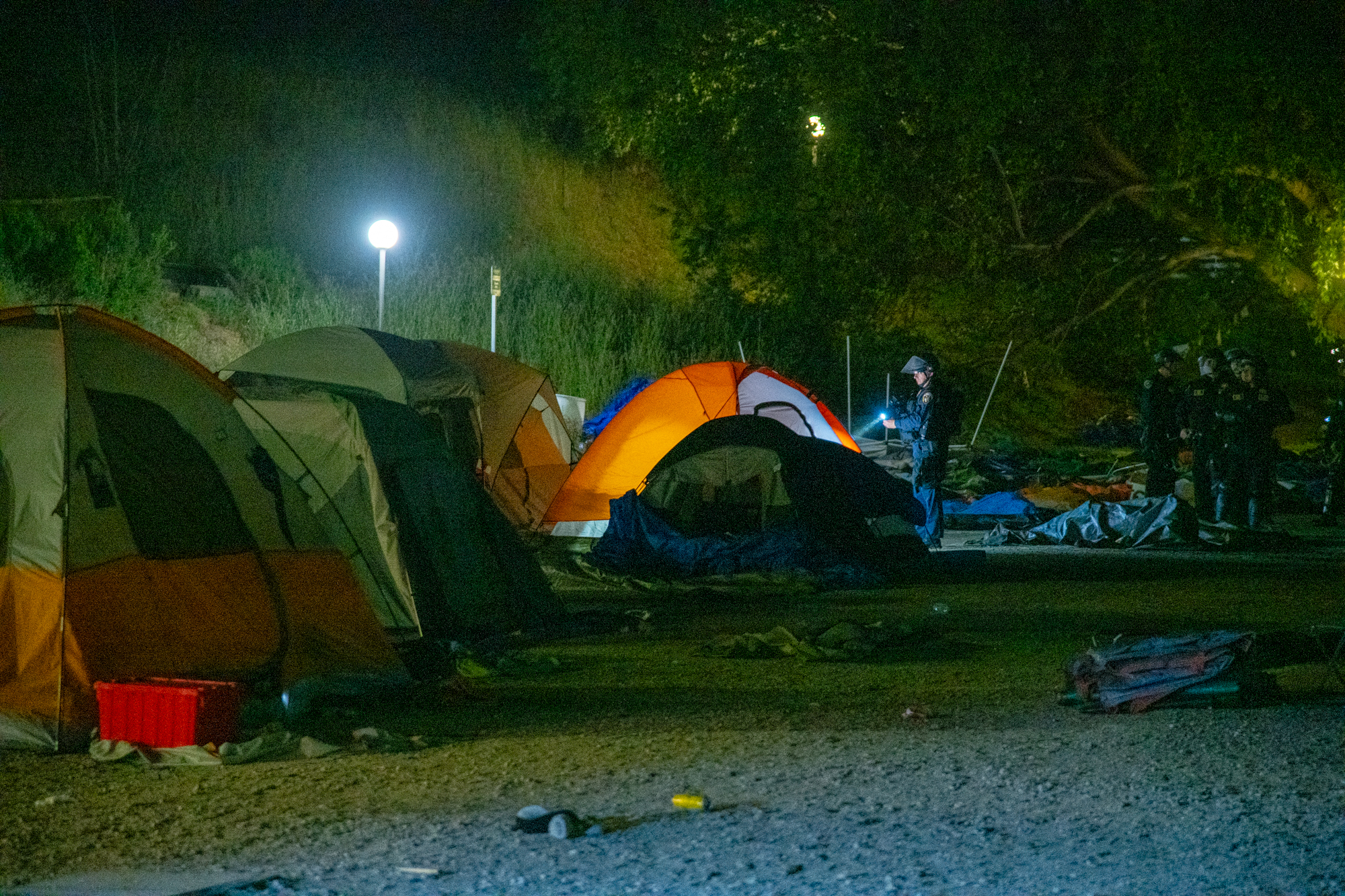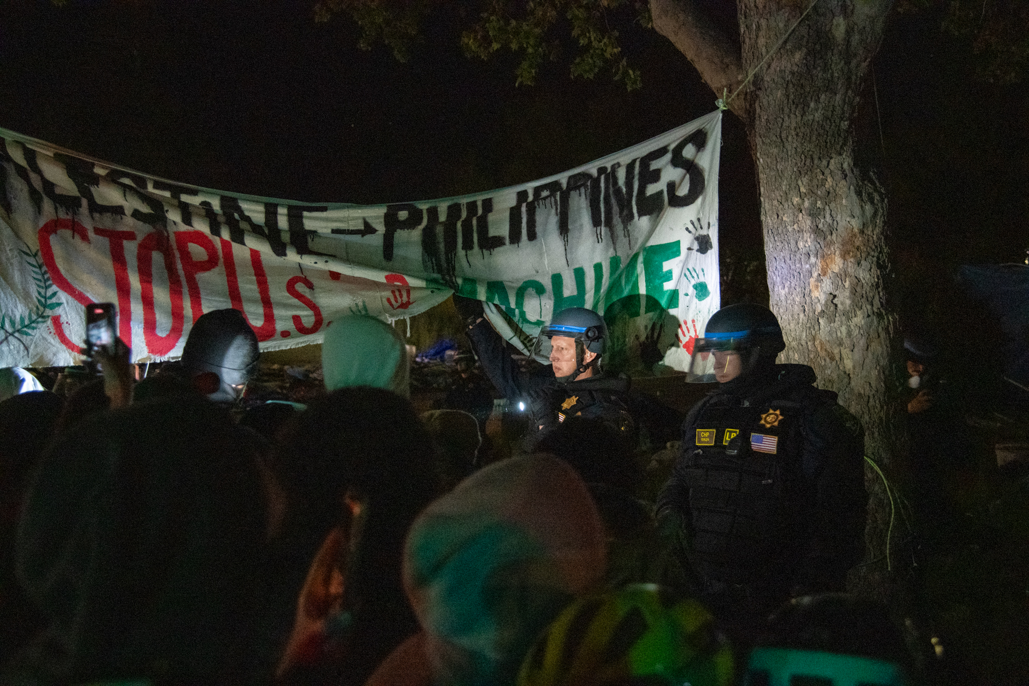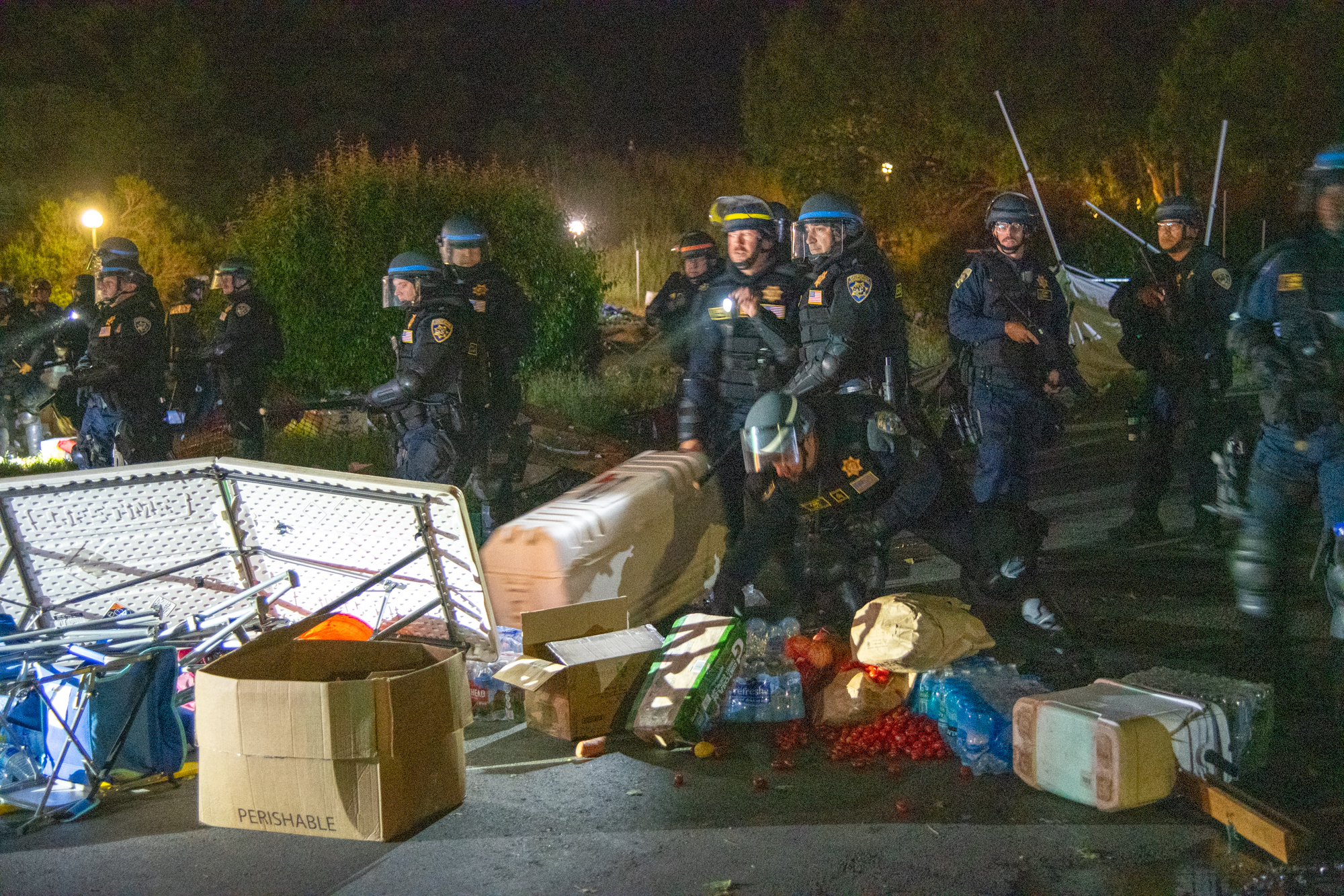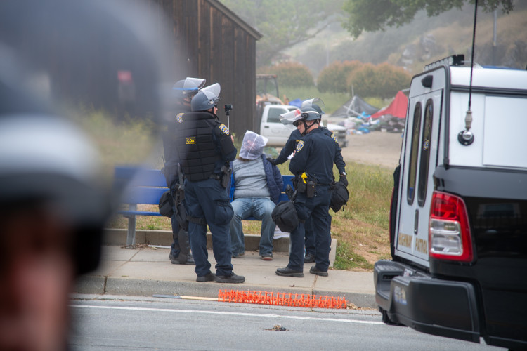Shortly after 1 am, police moved in and began destroying the tents in the encampment. Eventually they kettled the students, and then began a slow, methodical process of arresting people. Dozens of students had their wrists fastened with zip-ties so they could be taken to the Santa Cruz main jail . They were transported in busses and vans provided by outside agencies, such as the Santa Cruz Police Department and the Santa Clara County Sheriff's Office.