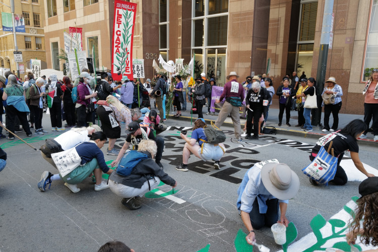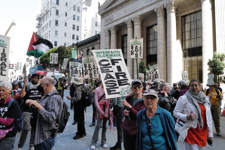 Human rights activists assembled at San Francisco’s Harry Bridge’s Plaza this morning before marching through the Financial District to the downtown office of California’s U.S. Senator Alex Padilla demanding he use his voice and his vote to call for an immediate and permanent ceasefire in Gaza.