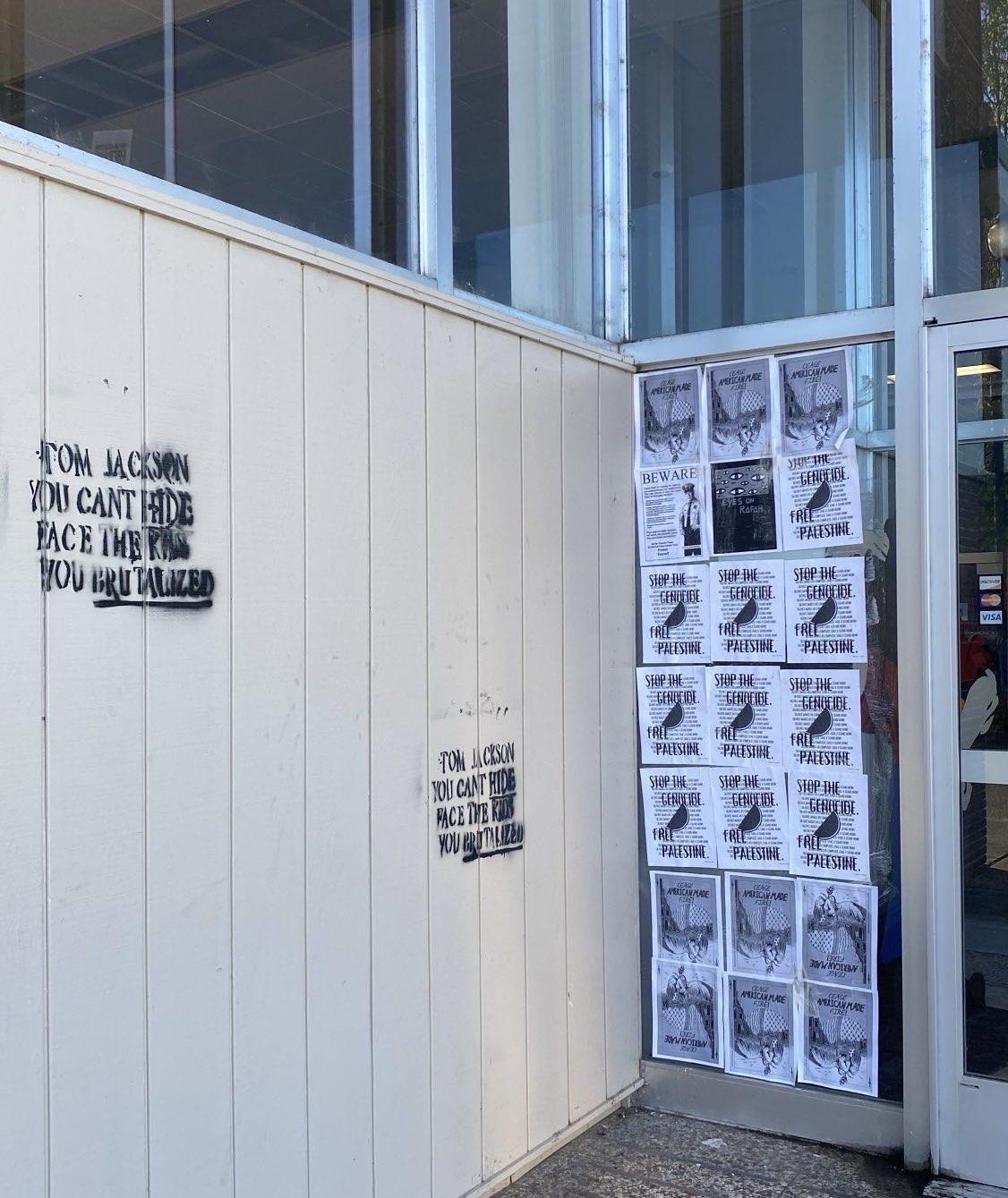 Our gift finds its way to one of the off-campus graduation venues. Glue squeezes into each lock, topped off with a tick coat of dog shit. Feces covers handlebars. Old cooking oil spills on the ground. All over the entrance, red paint reads “COMPLICIT IN GENOCIDE” and “ESCALATE FOR PALESTINE”.
