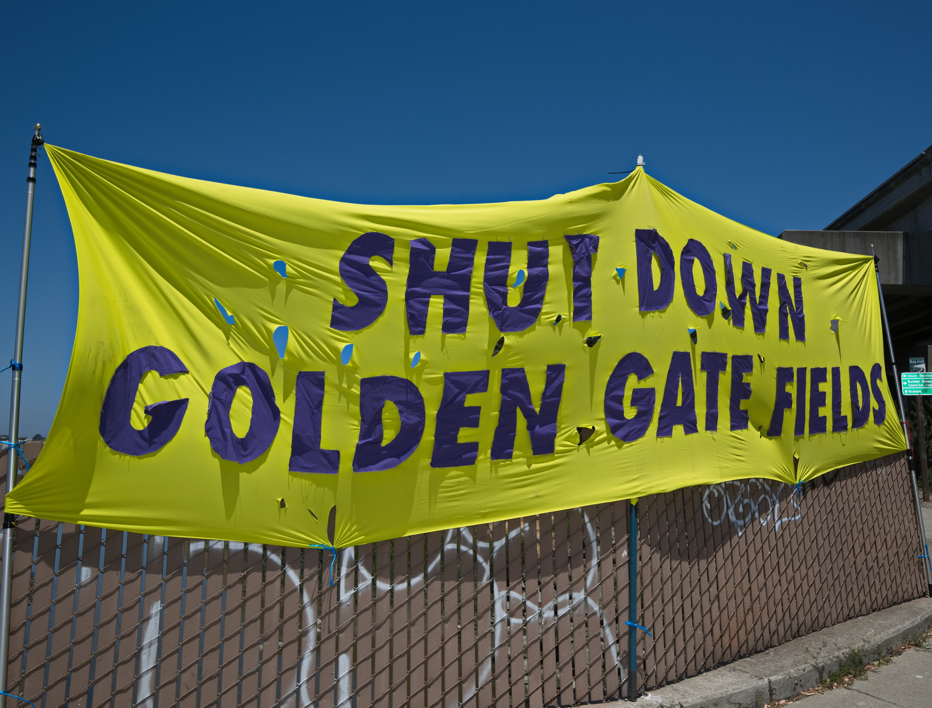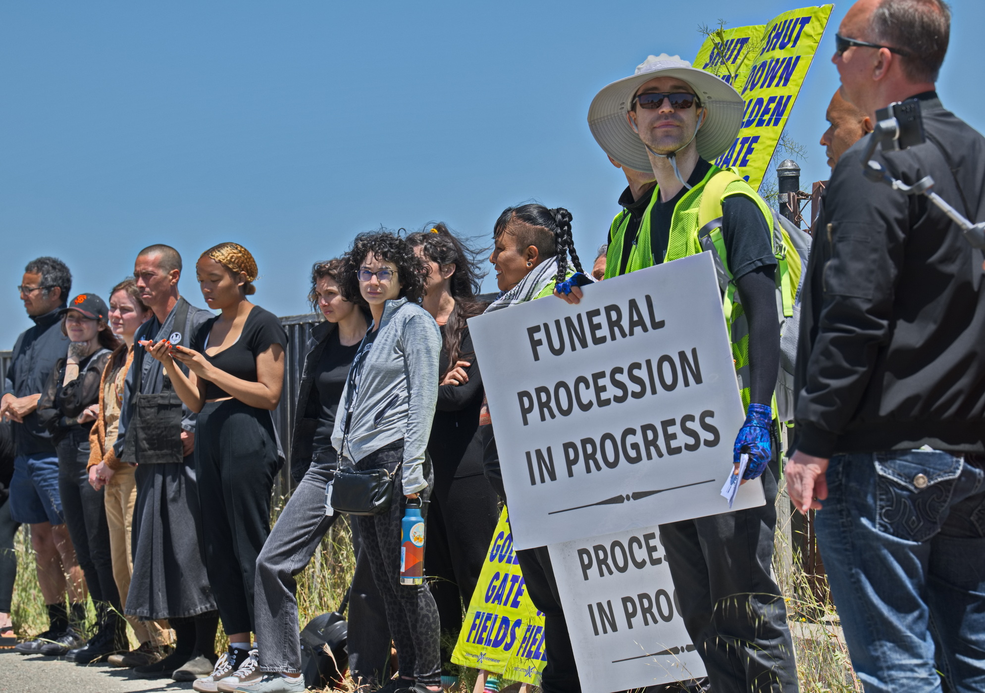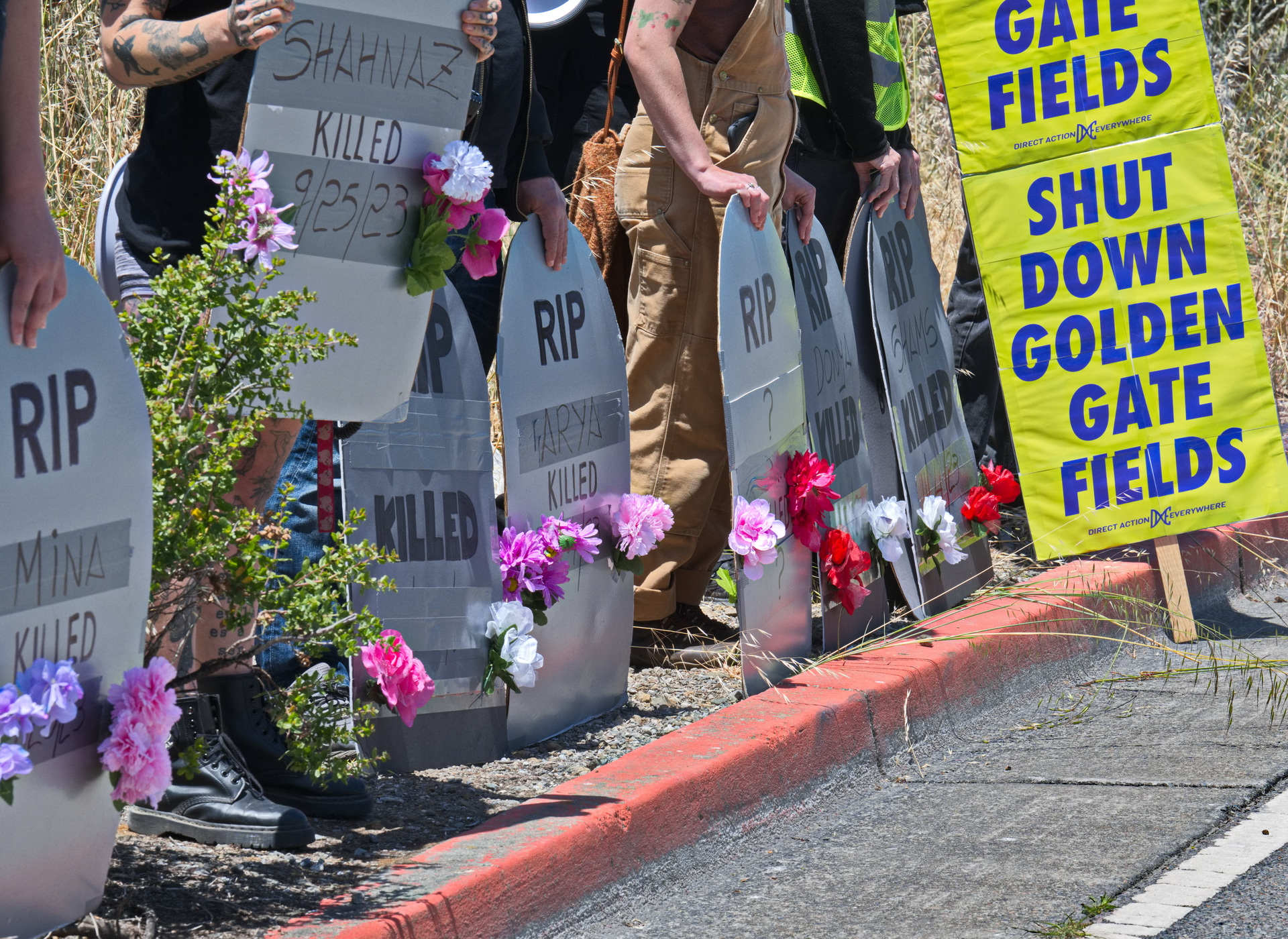(Albany, June 9) - Horse racing is ending at Golden Gate Fields to the satisfaction of the animal rights people at Direct Action Everywhere. They gathered there to hold a memorial to the many horses that suffered and died in the cruel "sport."Dressed in black, with a "coffin" and holding flowers, they held a short funeral procession to the intersection of Buchanan and I-580. Next to a giant banner that proclaimed "shut Down Golden Gate Fields" they spoke of horse racing's abuse of horses for "sport" and of how the animals are slaughtered when no longer useful.