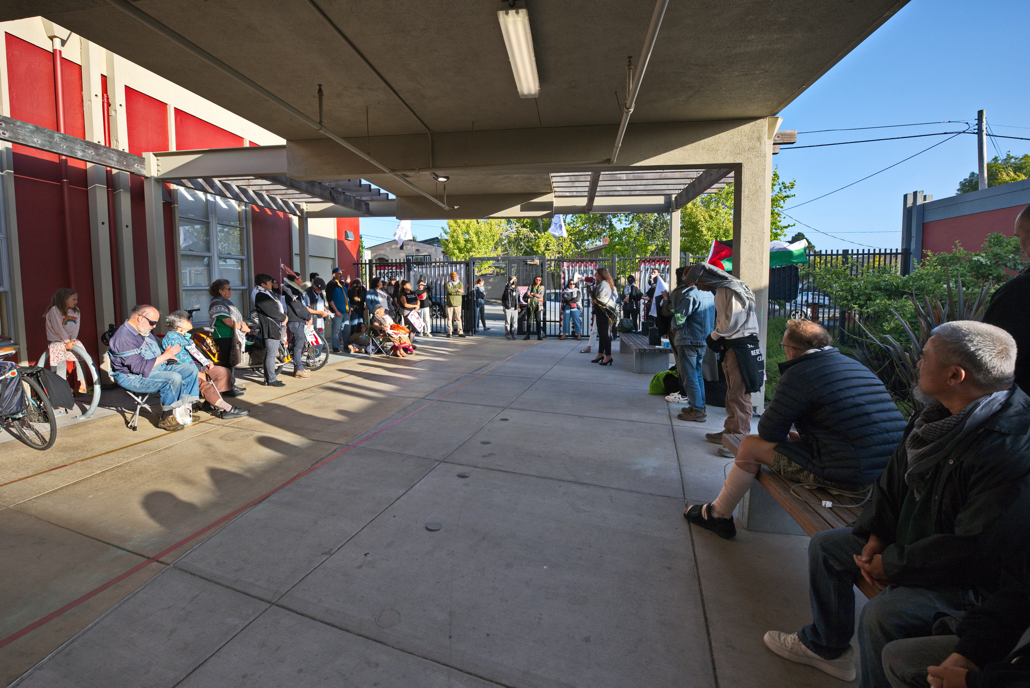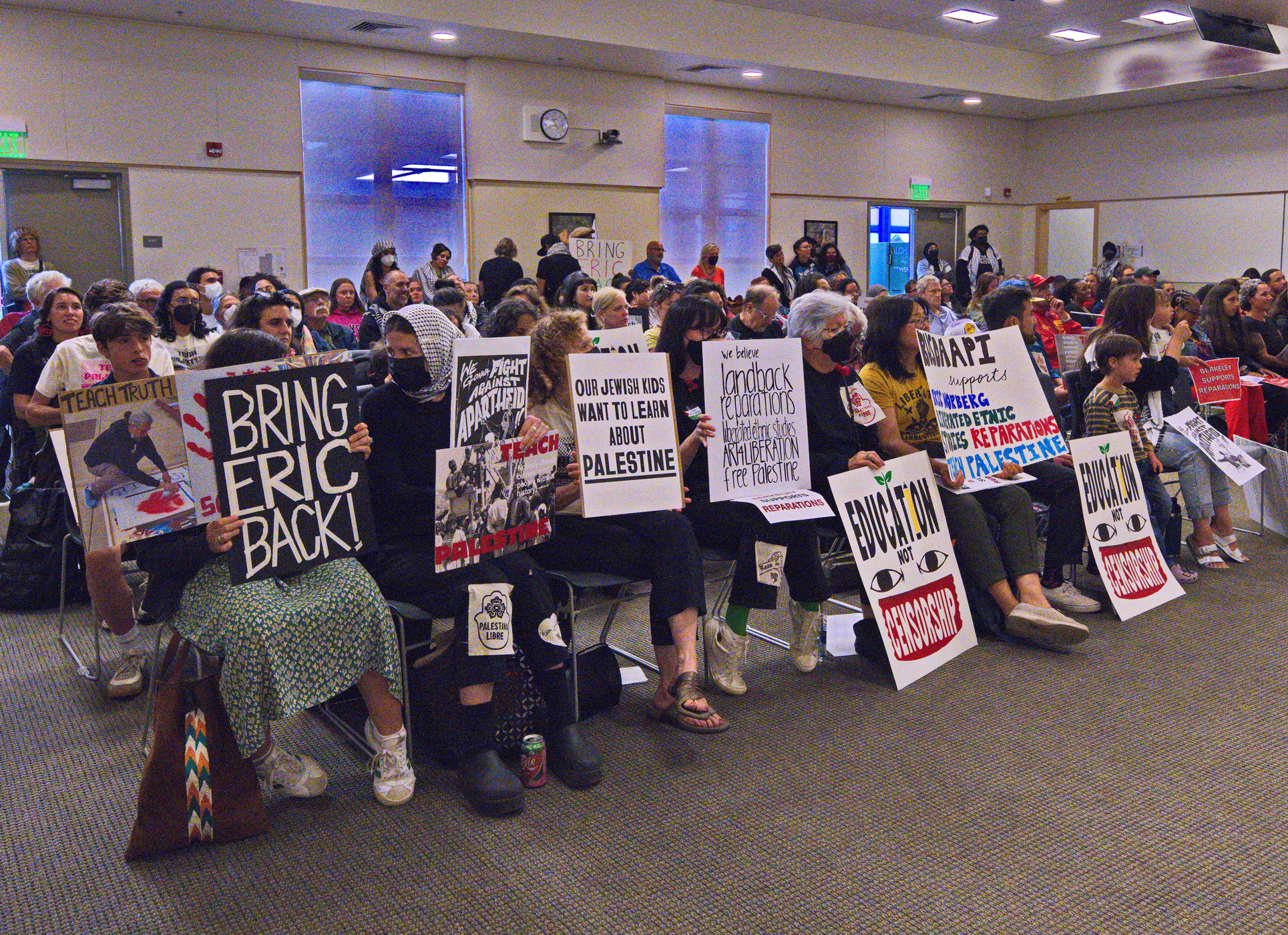 (Berkeley, June 12) - What do you do when the message is irrefutable criticism of those you identify with? In time honored tradition you, of course, attack the messenger. This is what some have done to beloved Berkeley art teacher and muralist Eric Norberg who has taught and inspired young people for twenty three years. Guilty of the crime of teaching about Palestine, he was put on administrative leave in March due to pressure from Zionist groups.But this was not acceptable to his students, fellow teachers and parents. With drumming and speeches, they rallied in front of the Berkeley Unified School District's meeting room at 1231 Addison Street. They then packed the year's last board meeting of the year and made their feelings known.