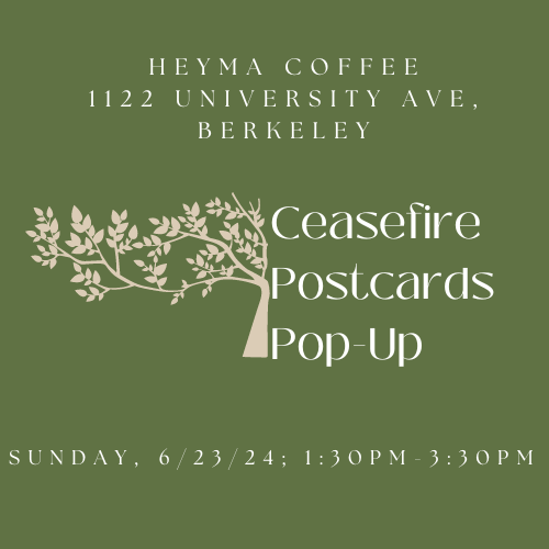 We must increase the pressure on elected officials to stop the genocide in Gaza and settler/IOF violence in the West Bank. Write postcards with us; call Congress from home; join local actions; sign petitions; contribute to mutual aid groups; support ngos on the ground; donate to candidates' campaigns who are calling for a ceasefire. We’re in this together for the long haul to end Israel’s illegal occupation of Palestine.