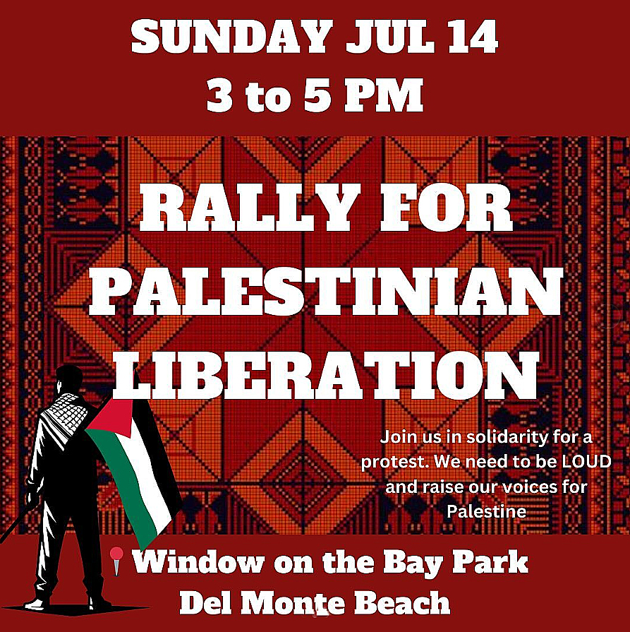 Every Sunday til Ceasefire! We raise our voices higher, higher! Protest. Gather. Learn. Music. Art. Solidarity. At Windows on the Bay Park, Del Monte Beach, Monterey. Happening every Sunday from 3-5pm, rain or shine. Join MPS organizers each week to find community, build solidarity, learn, create, and grow the local movement for Palestinian liberation in the Monterey Peninsula area!