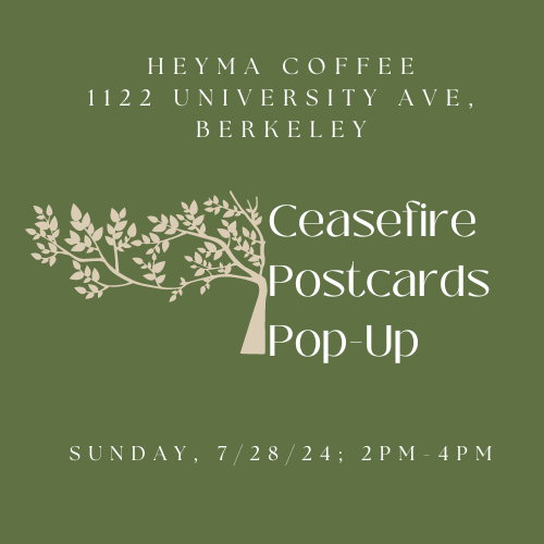 We must increase the pressure on elected officials to stop the genocide in Gaza and settler/IOF violence in the West Bank and East Jerusalem. Write postcards with us; call Congress from home; join local actions; sign petitions; contribute to mutual aid groups; support ngos on the ground; donate to candidates' campaigns who are calling for a ceasefire. We’re in this together for the long haul to end Israel’s illegal occupation of Palestine.