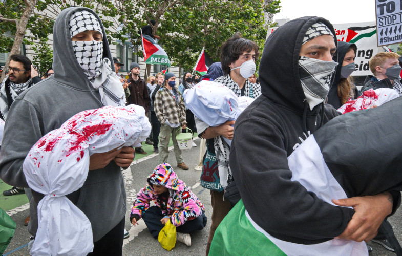 The "bloody" white shroud containing the small body of a destroyed child, has now become the symbol of this genocide. These were carried by demonstrators next to an effigy of Netanyahu, smeared with blood. One sign from the Revcoms summarized that "Israel had done something truly incredible - Israel has turned Jews into Nazis!"