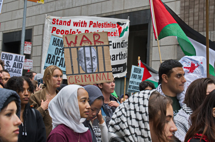 (San Francisco, July 27) - As Israel's Prime Minister Netanyahu, eyeing a possibly less complicit US administration being elected, rushes to complete the genocide of Palestine, protests are continuing.On the heels of the Code Pink action just three days before, close to a thousand people gathered at the Seventh Street Federal Building. They rallied and then marched up Market Street to rally again in front of Israel's Montgomery Street Consulate.
