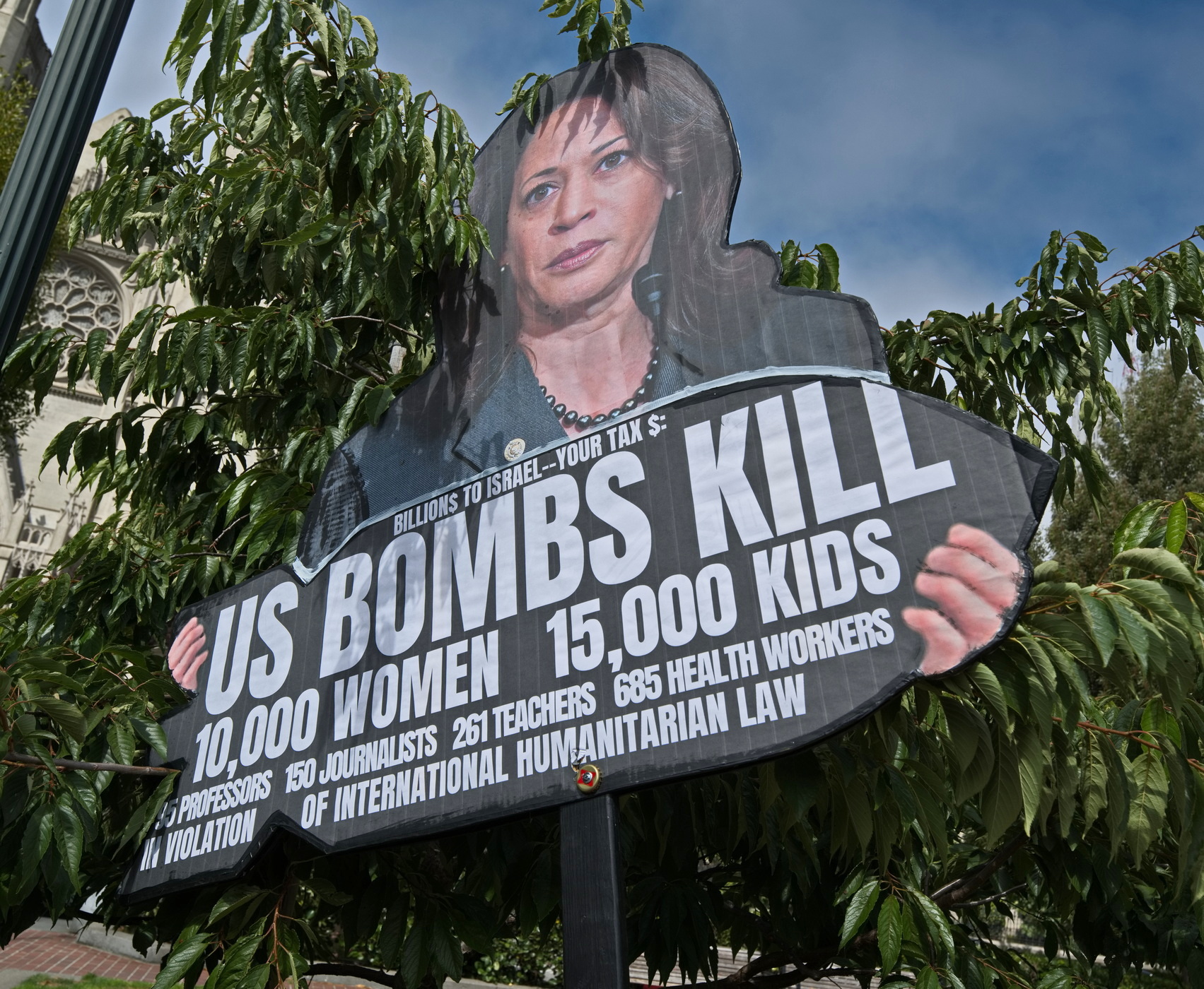 Kamala Harris came to San Francisco today to hold a fundraising dinner with the city's moneyed elite. Activists assembled in nearby Huntington Park and also came from Union Square to give the candidate a message of protest about the Biden administration's complicity in Israel's ongoing genocide of Palestine.Tickets to the exclusive event ran from $3300 to $500,000 (that's half a million, not a typo). I was told that the event was "sold out" but if I went for a couple of $500,000 tickets, I would, however, be "accommodated."