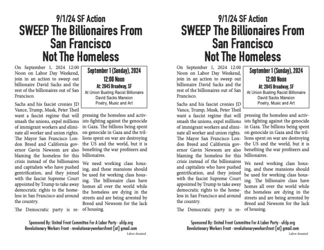 On September 1, 2024 12:00 Noon on Labor Day Weekend join in an action to sweep out billionaire David Sachs and the rest of the billionaires out of San Francisco. Sachs and his fascist cronies JD Vance, Trump, Musk, Peter Theil want a fascist regime that will smash the unions, expel millions of immigrant workers and bring eliminate all worker and union rights.